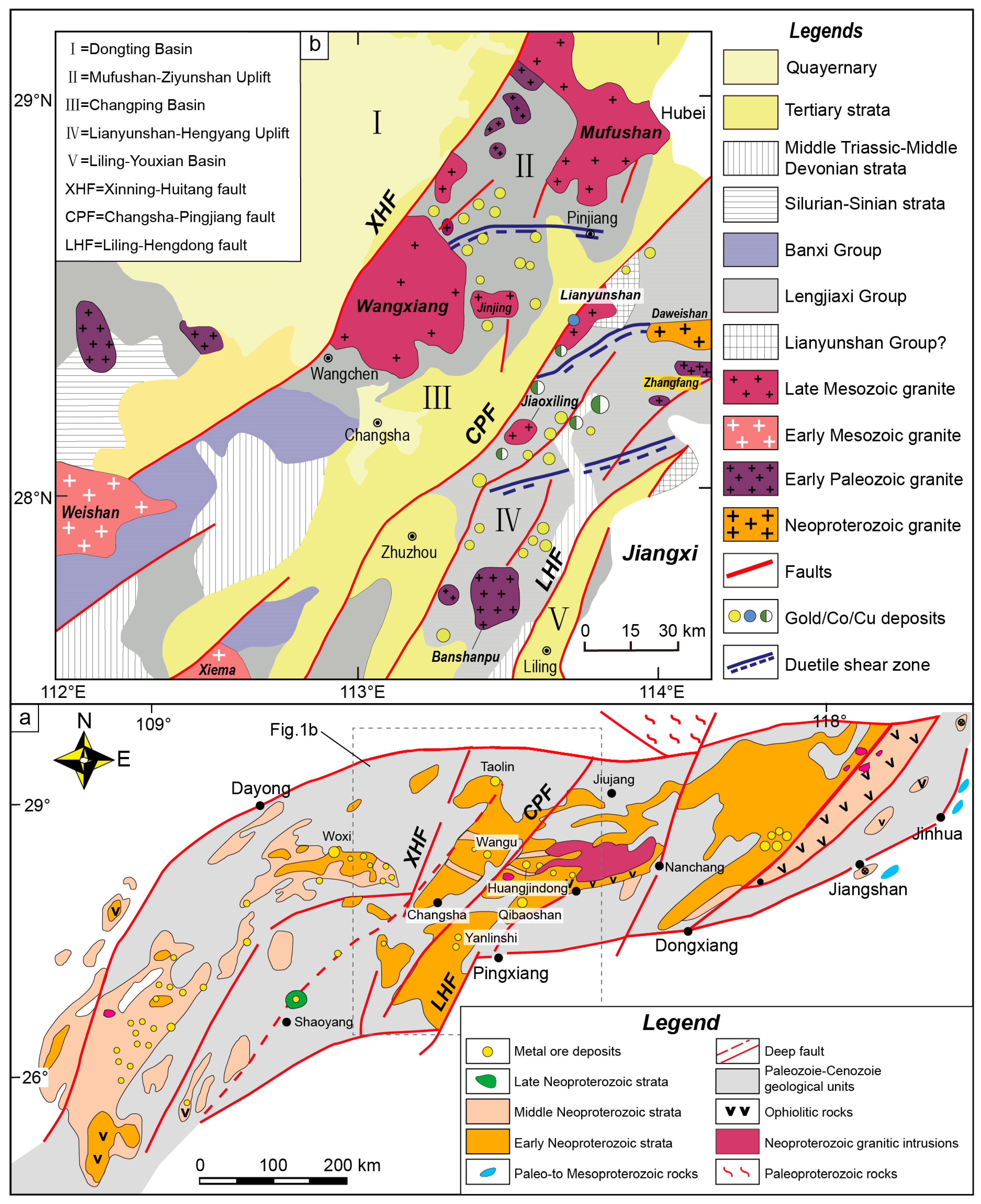 - Xu, D.; Deng, T.; Chi, G.; Wang, Z.; Zou, F.; Zhang, J.; Zou, S. Gold mineralization in the Jiangnan Orogenic Belt of South China: Geological, geochemical and geochronological characteristics, ore deposit-type and geodynamic setting. Ore Geol. Rev. 2017, 88, 565–618. [Google Scholar] [CrossRef]