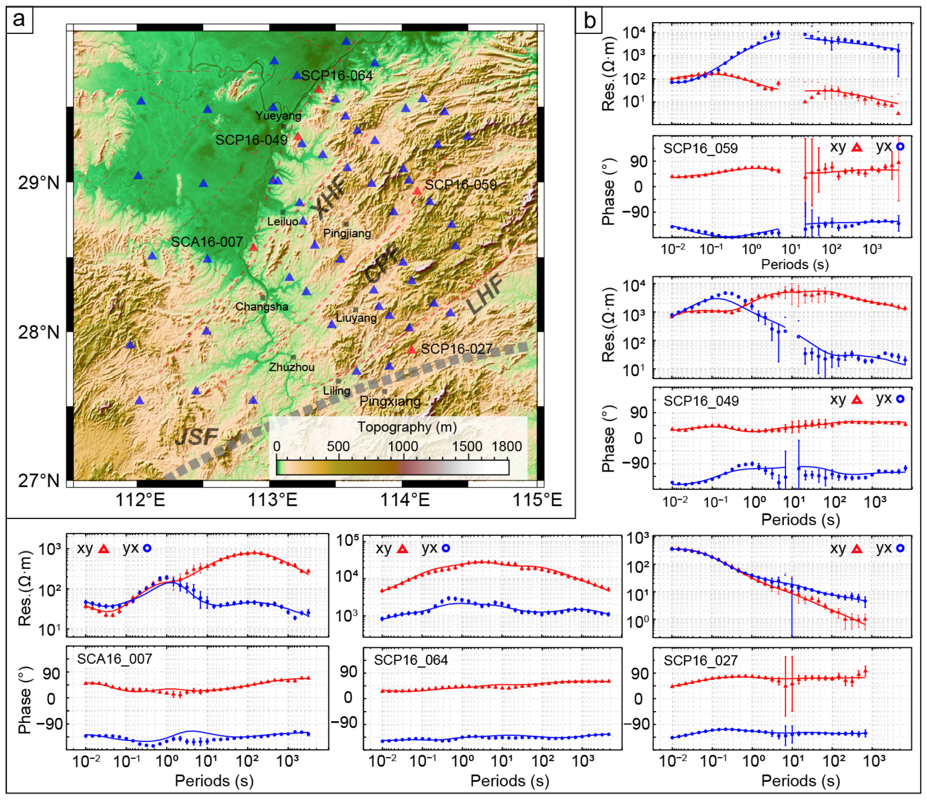 - Cheng, Y.; Han, B.; Li, Y.; Guo, J.; Hu, X. Lithospheric electrical structure beneath the Cathaysia Block in South China and its tectonic implications. Tectonophysics 2021, 814, 228981. [Google Scholar] [CrossRef]