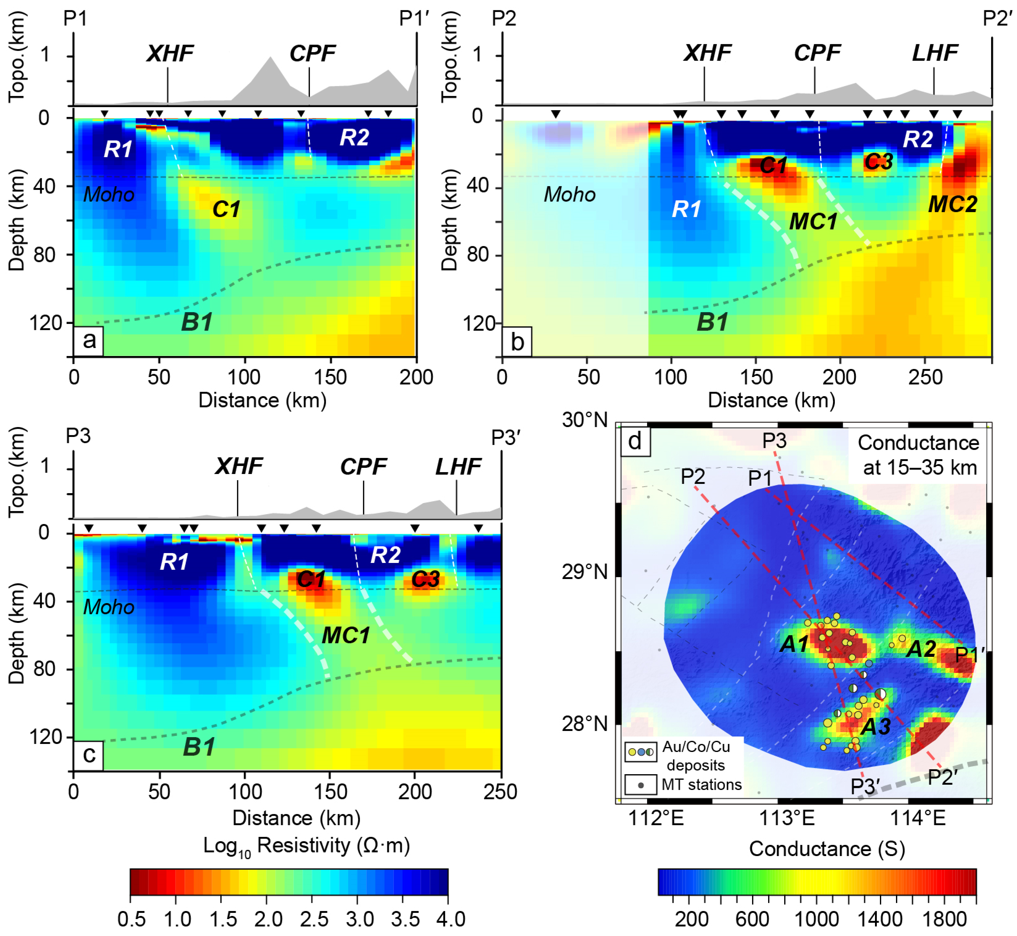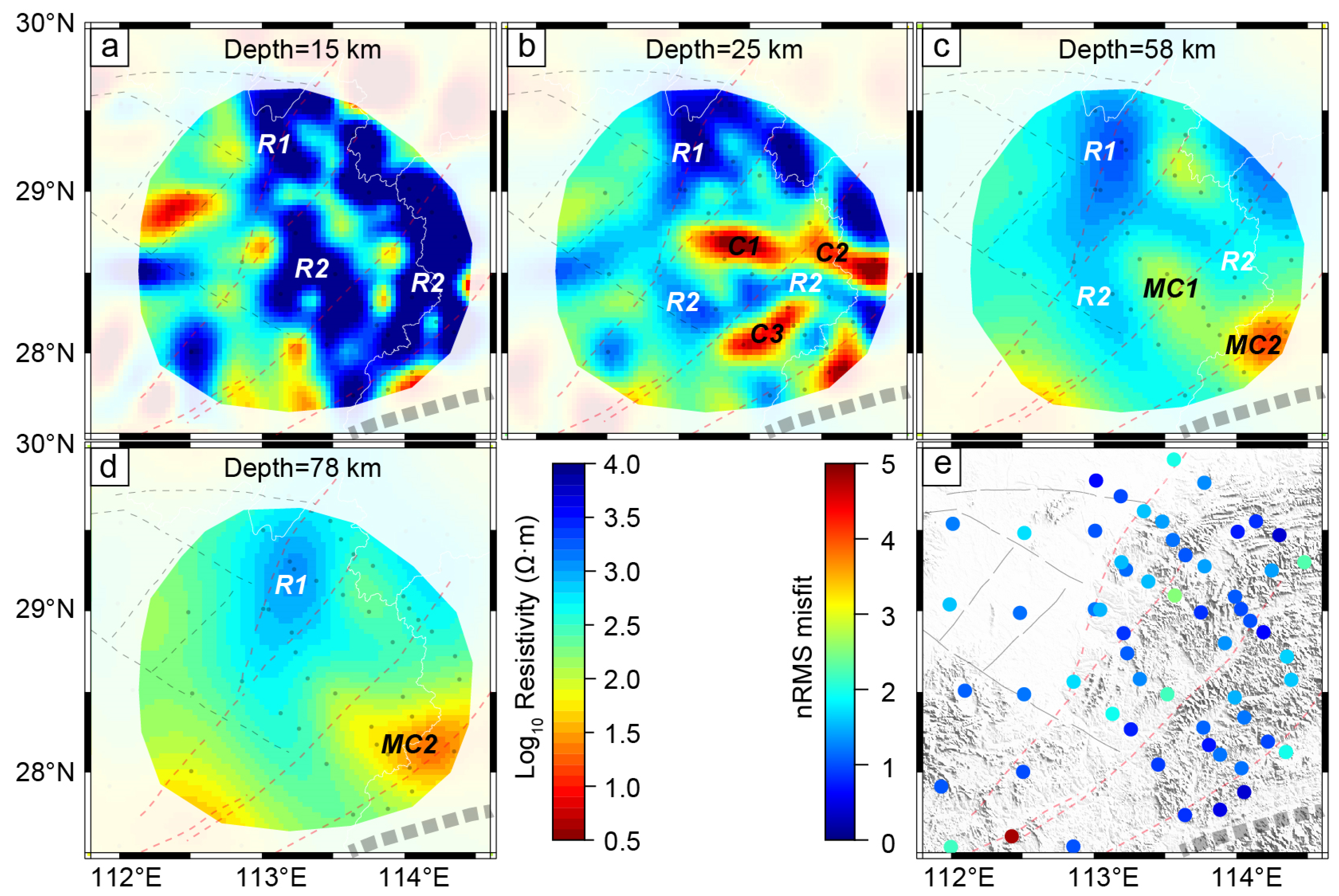 - Li, X.; Bai, D.; Chen, Y.; Deng, Y.; Zhang, S.; Xue, S. Magnetotelluric signatures of Neoproterozoic subduction, and subsequent lithospheric reactivation and thinning beneath central South China. Tectonophysics 2022, 833, 229365. [Google Scholar] [CrossRef]