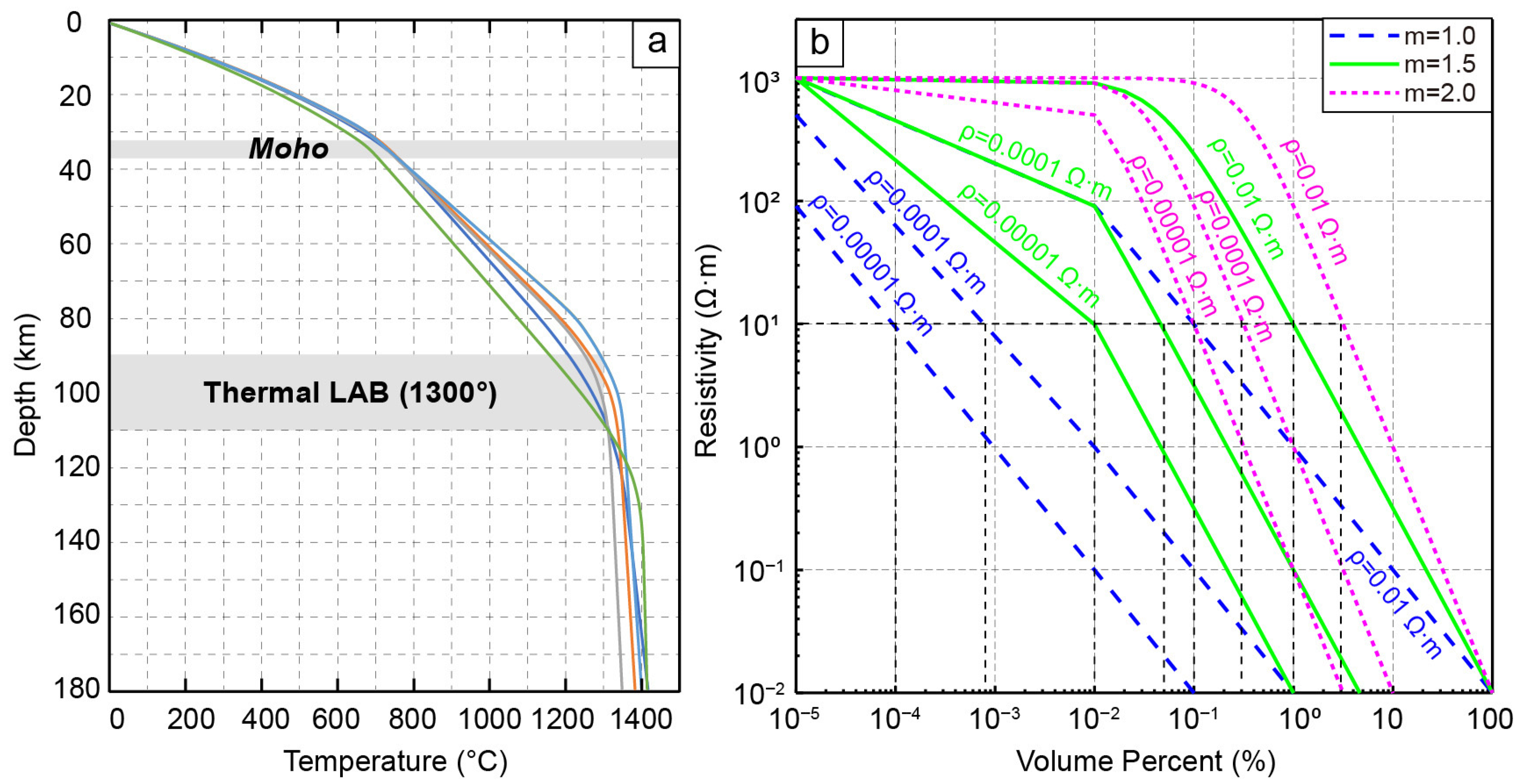 - Zhang, B.; Fei, H.; Yoshino, T.; Xia, Q. Some new insights about electrical discontinuities in the cratonic lithosphere. Earth-Sci. Rev. 2023, 246, 104592. [Google Scholar] [CrossRef]