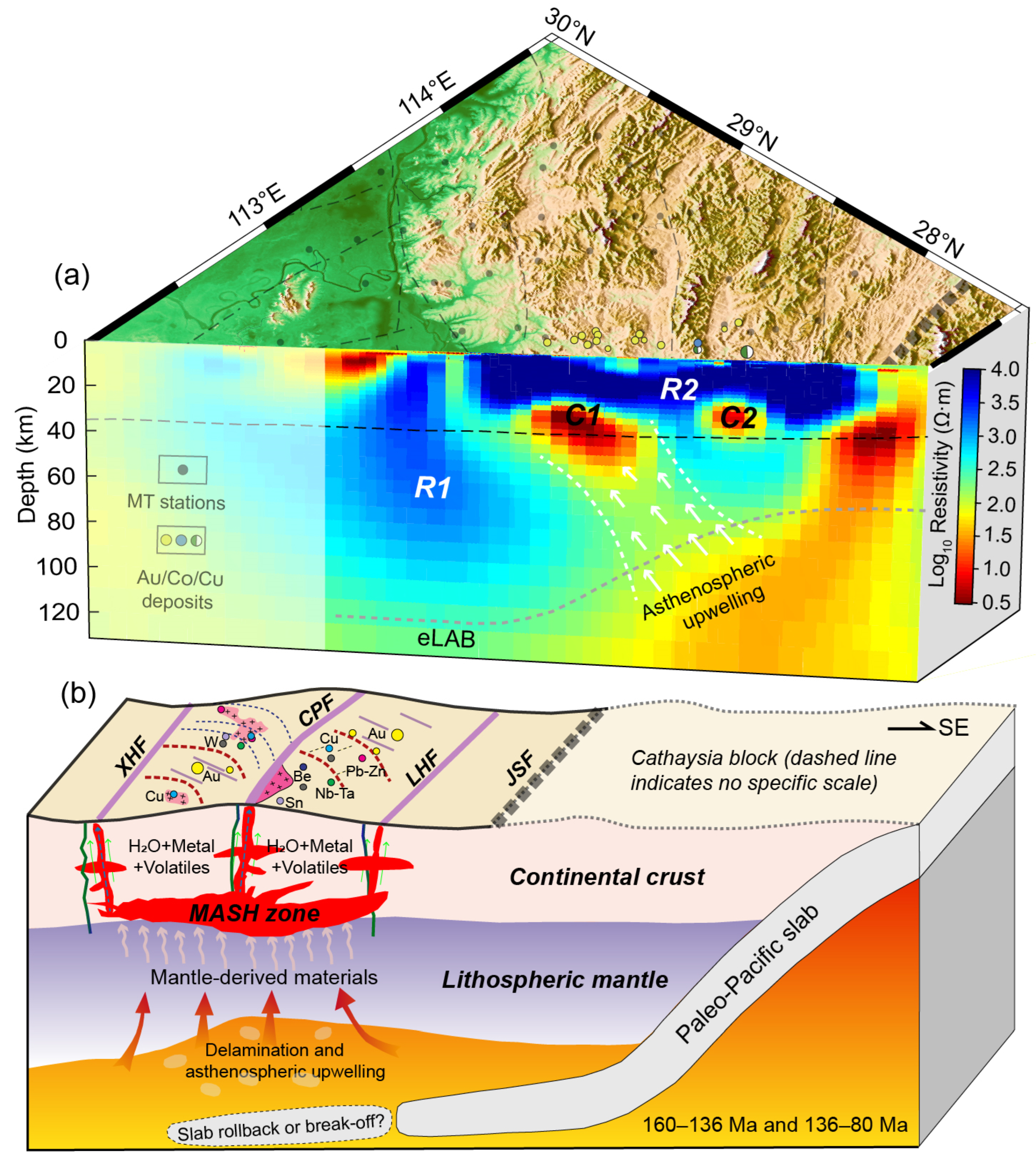 - Zhang, H.; Lü, Q.; Wang, X.; Han, S.; Liu, L.; Gao, L.; Wang, R.; Hou, Z. Seismically imaged lithospheric delamination and its controls on the Mesozoic Magmatic Province in South China. Nat. Commun. 2023, 14, 2718. [Google Scholar] [CrossRef]