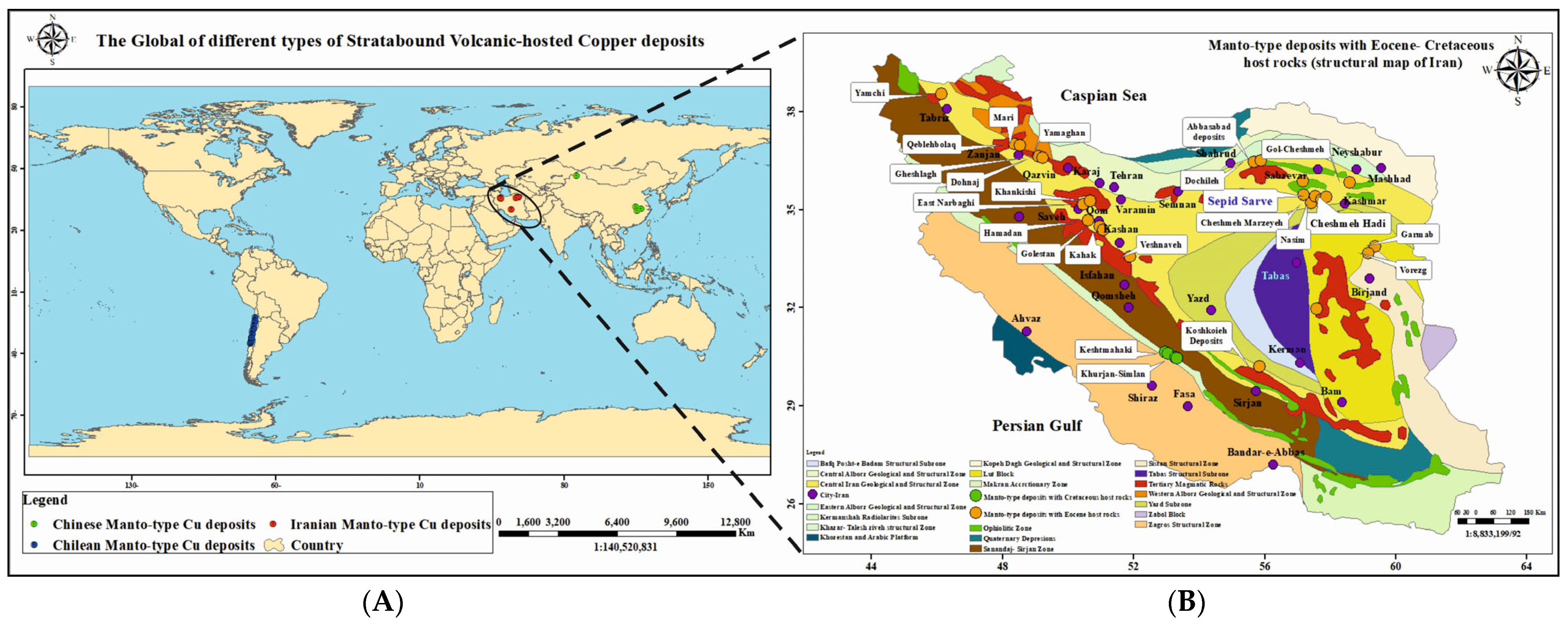 - Movahednia, M.; Maghfouri, S.; Fazli, N.; Rastad, E.; Ghaderi, M.; González, F.J. Metallogeny of Manto-type stratabound Cu-(Ag) mineralization in Iran: Relationship with NeoTethyan evolution and implications for future exploration. Ore Geol. Rev. 2022, 149, 105064. [Google Scholar] [CrossRef]