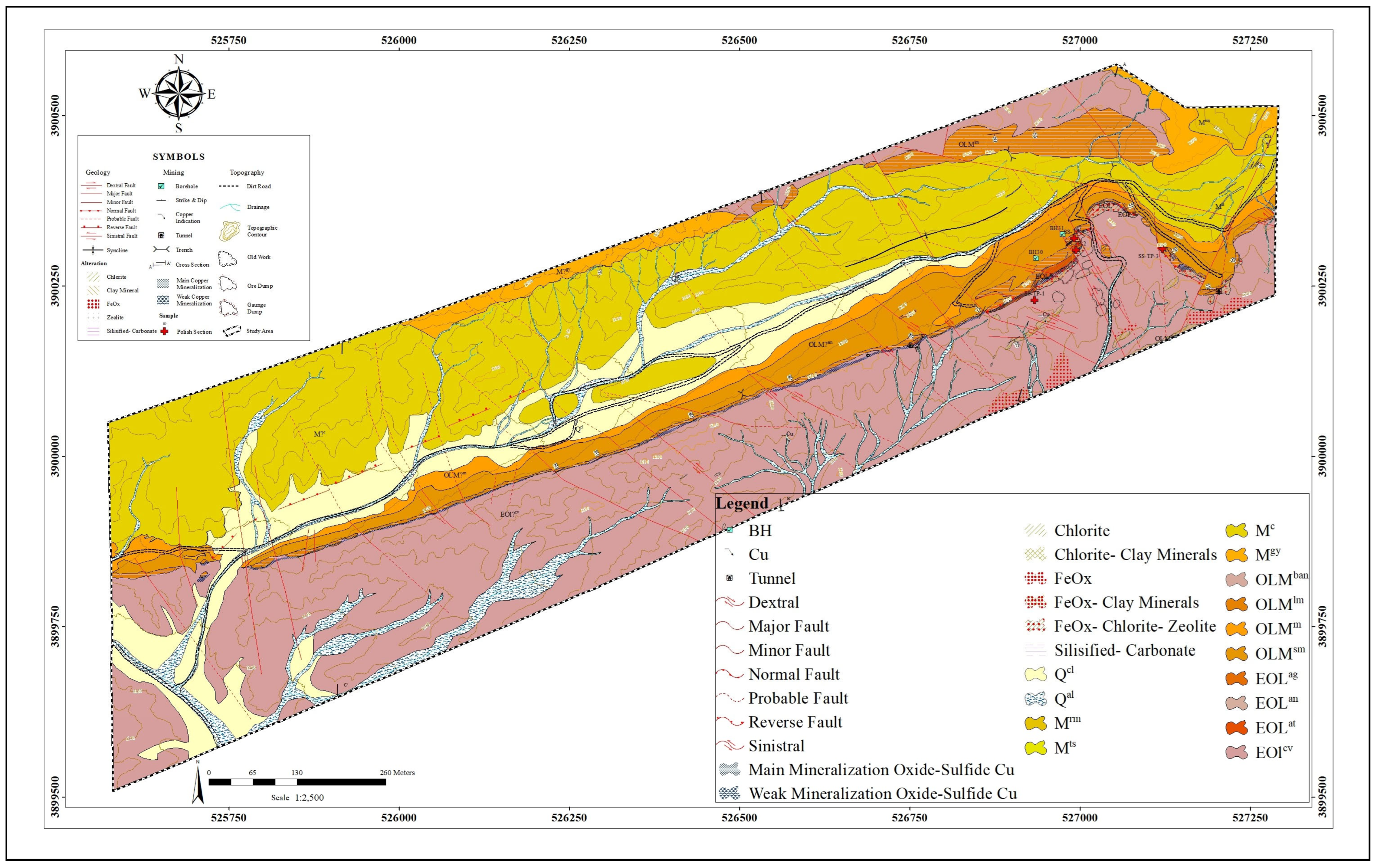 - Maghfouri, S.; Movahednia, M. Investigation of geology and mineralization of Abbas Abad copper deposit and comparison with Manto-type deposit. In Proceedings of the 18th Symposium of the Geological Society of Iran, Tehran, Iran, 24 December 2014; Tarbiat Modares University: Tehran, Iran (In Persian with English abstract). [Google Scholar]