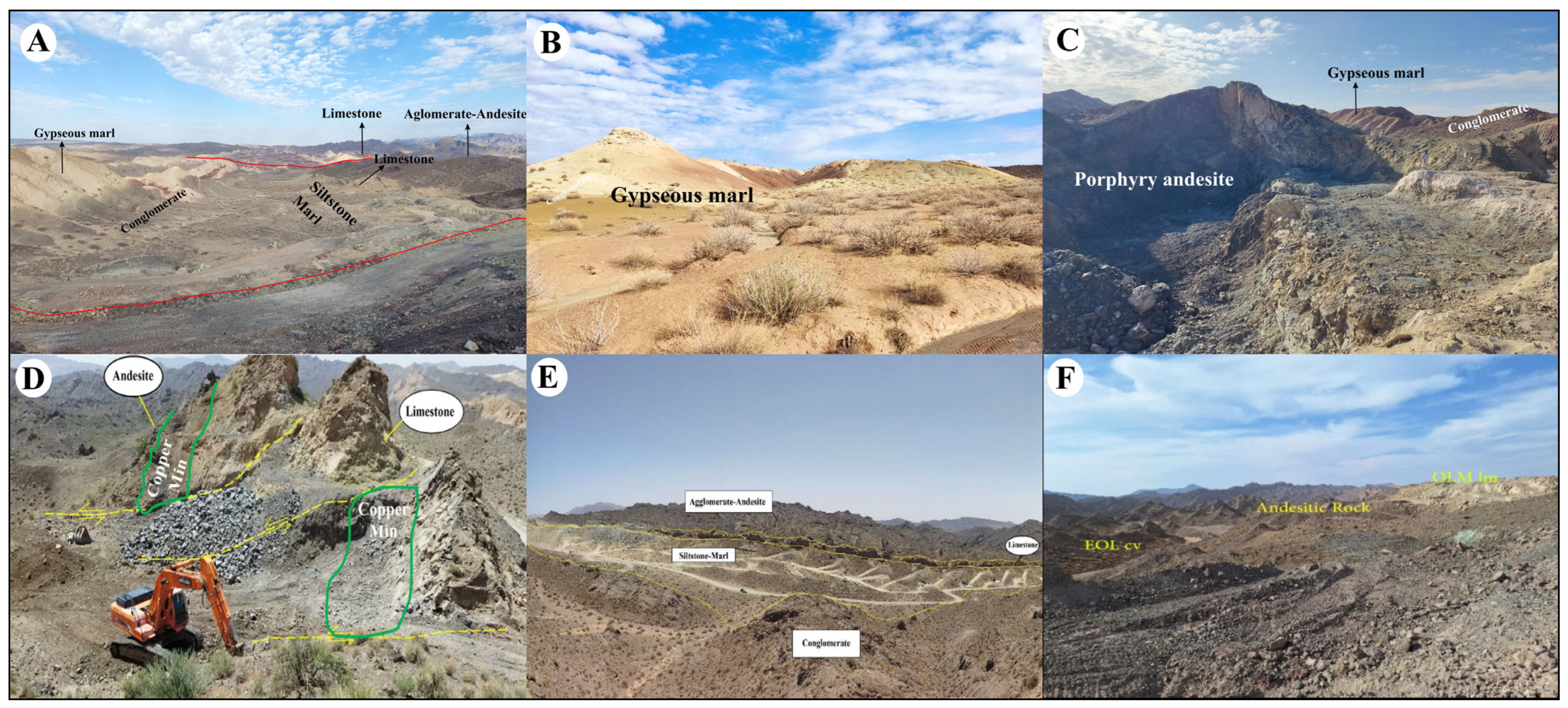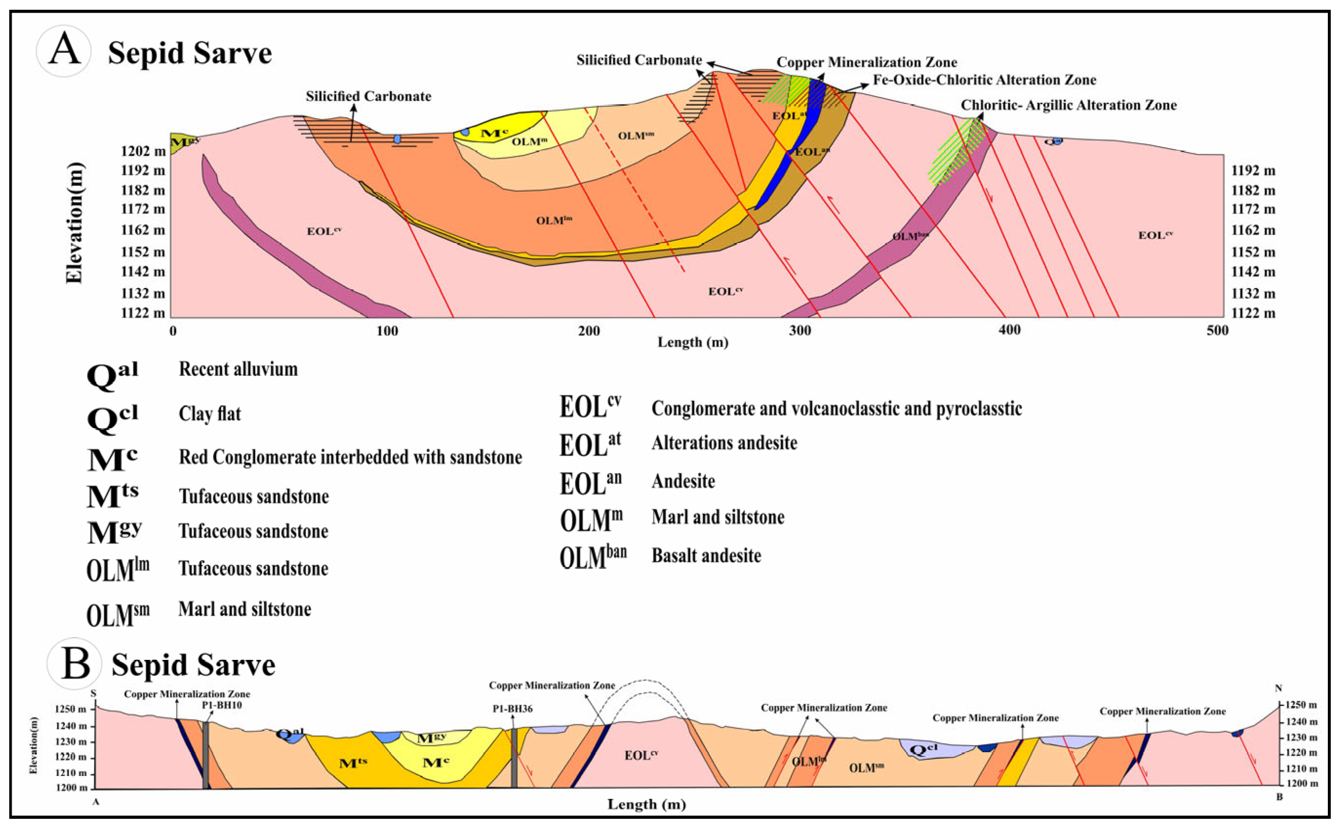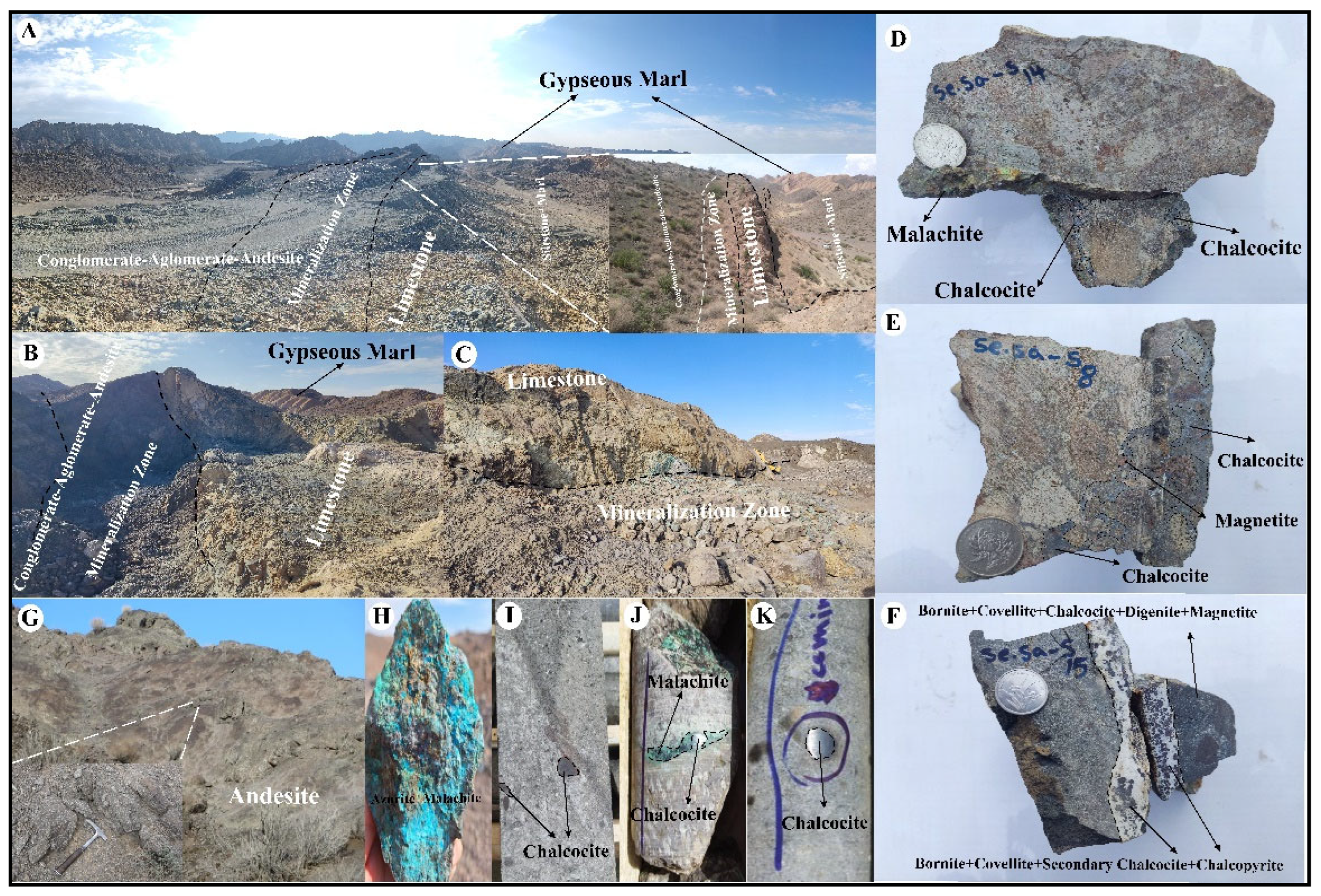 - Jabari, A.; Malekzadeh Shafaroudi, A.; Karimpoor, M.H. The stratabound (mantle-type) copper deposit of Kal Abri in the Eocene volcano-sedimentary complex, NW Bardaskan, NE Iran. J. Adv. Appl. Geol. 2016, 23, 142. [Google Scholar]