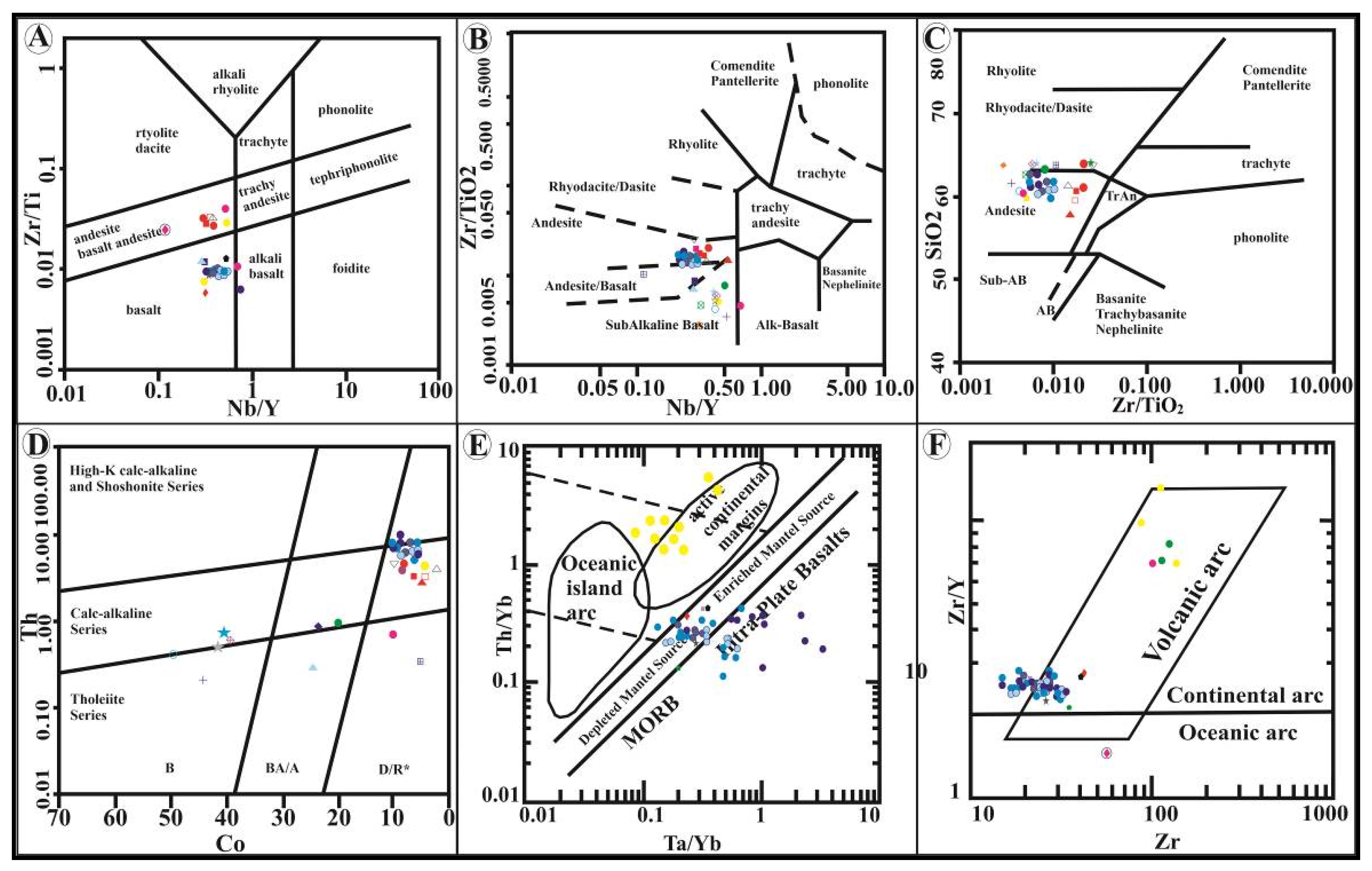- Hasite, A.R.; Kerr, A.C.; Pearce, J.A.; Mitchell, S.F. Classification of altered volcanic island arc rocks using immobile trace elements: Development of the Th-Co discrimination diagram. J. Petrol. 2007, 48, 2341–2357. [Google Scholar] [CrossRef]
