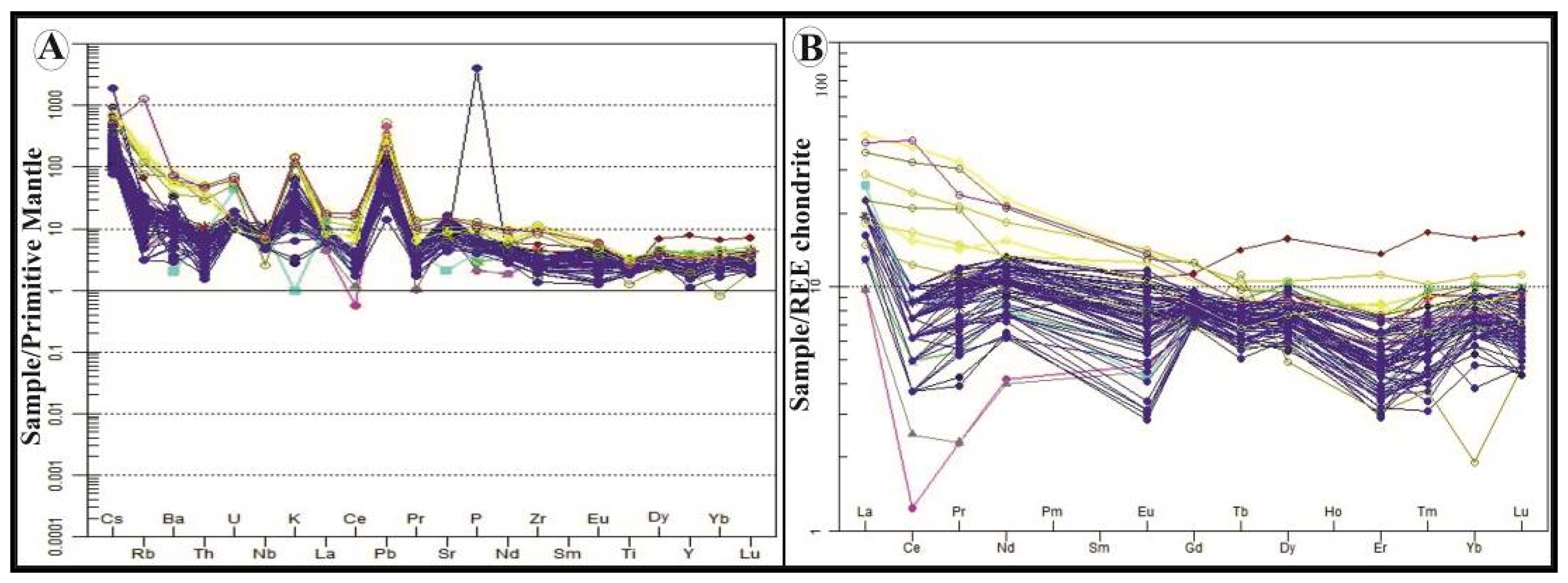 | Sample | SiO2 | Al2O3 | Na2O | MgO | K2O | TiO2 | CaO | Fe2O3 | Ag | Pb | Cu | Mo | Bi | Fe | Co | Ni | Ti | Sb | Tl | Li | Be | Na | K | Ca | Mg | Al | Ga | Cs | Rb | Ba | Sr | Th | U | Y | Zr | Hf | Nb | Ta | P | La | Ce | Pr | Nd | Sm | Eu | Er | Gd | Tb | Dy | Ho | Tm | Yb | Lu |