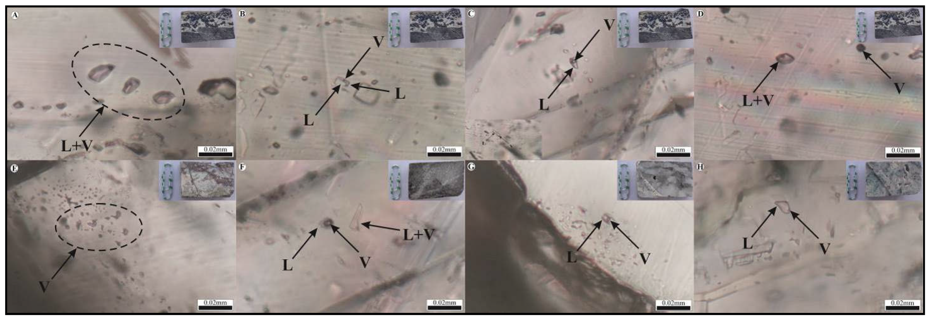 - Bodnar, R.J. A method of calculating fluid inclusion volumes based on vapor bubble diameters and P-V-T-X properties on inclusion fluids. Econ. Geol. 1983, 78, 534–542. [Google Scholar] [CrossRef]