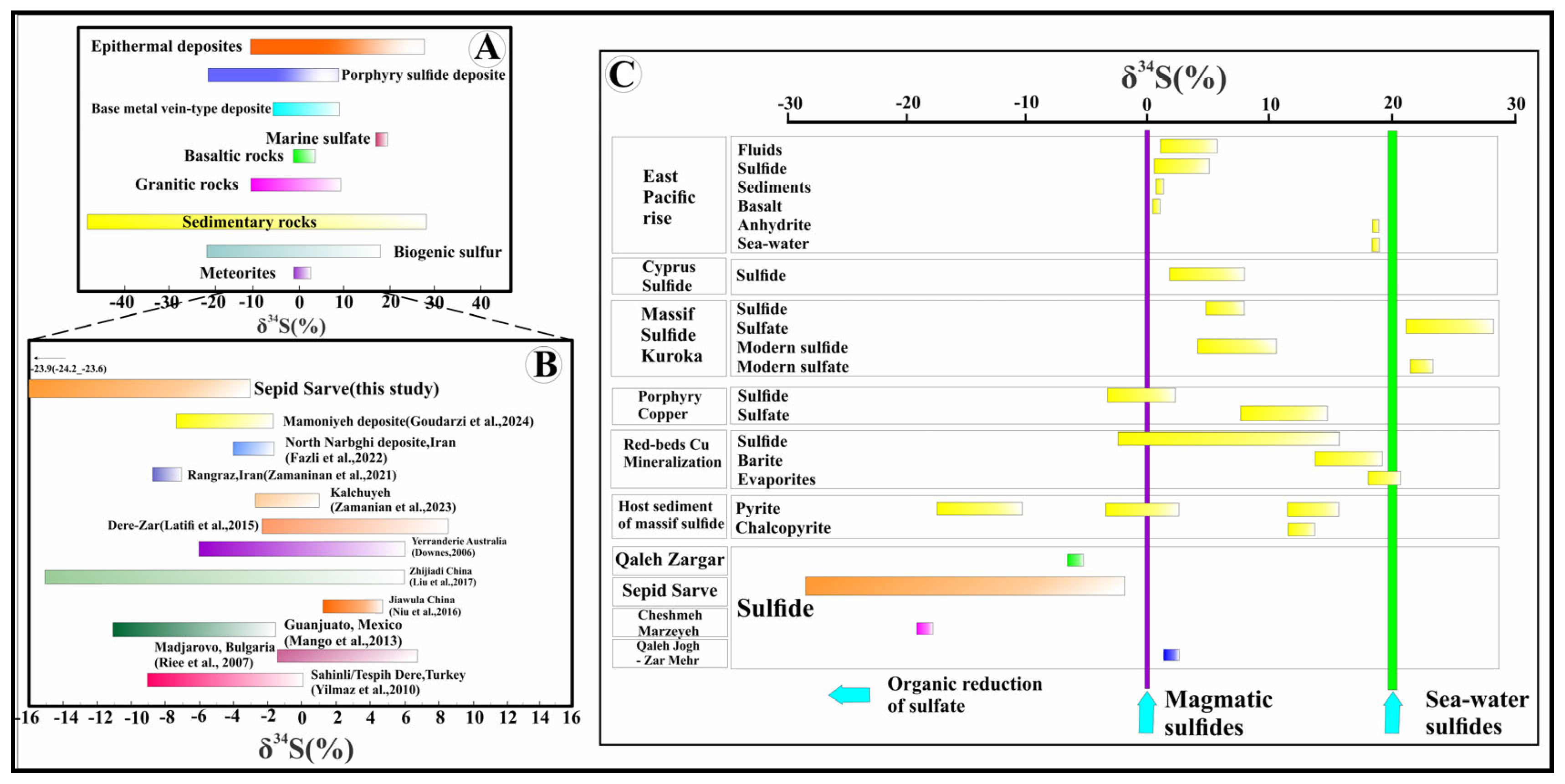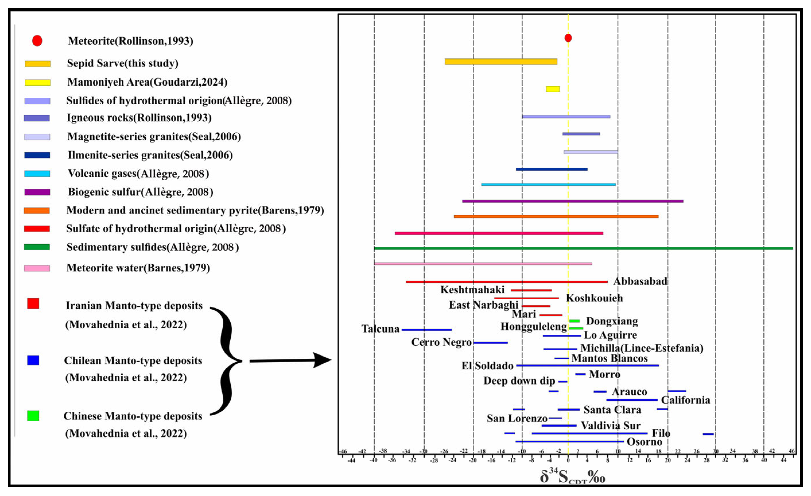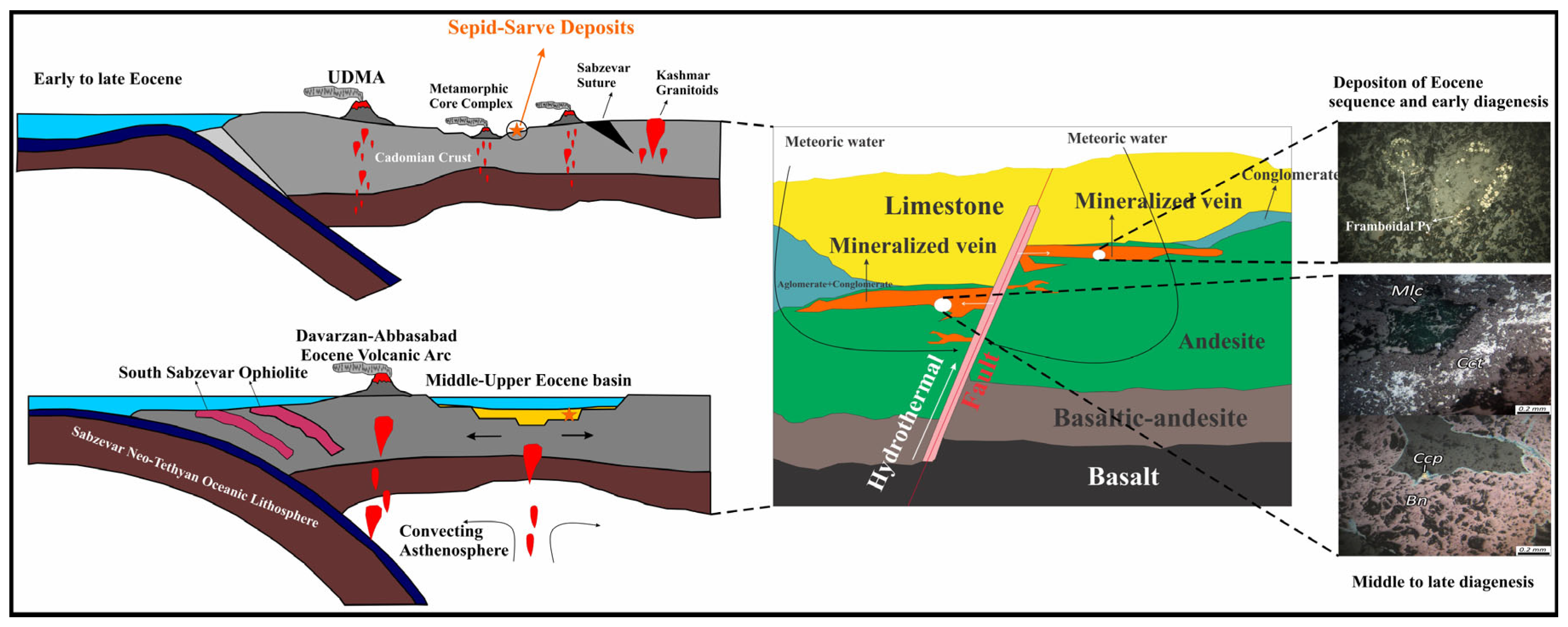 Esform M, Zamanian H, Klötzli U, Zarasvandi A, Almasi A, Goudarzi M. Evolutionary Model of the Sepid-Sarve Manto-Type Copper Mineralization, Doruneh Fault Volcanic-Plutonic Belt (Central Iran Domain, NE Iran): An Integrated Geological, Geochemical, Fluid-Inclusion and Stable O–S Isotope Study. Minerals. 2025; 15(12):1246. https://doi.org/10.3390/min15121246