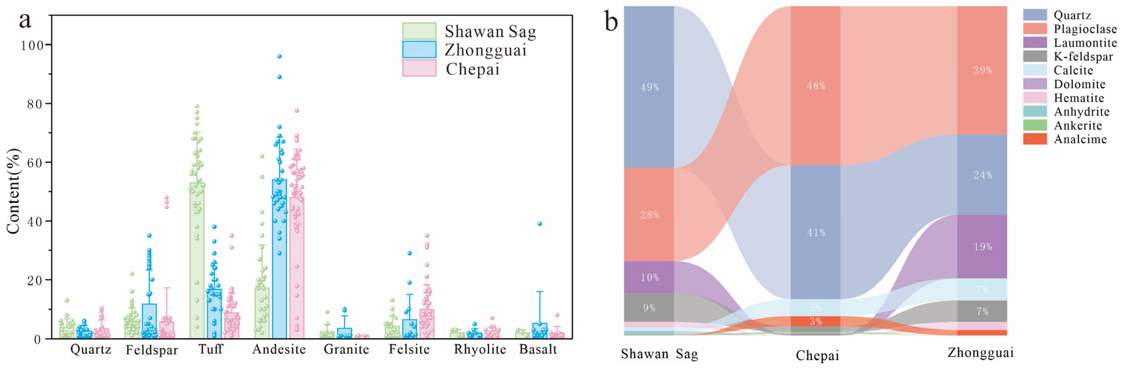 Figure 3. Gravel composition of the Lower Permian in the Shawan Sag and adjacent areas. (a) Comparison of clastic grain composition from thin-section petrographic analysis in the Shawan Sag and adjacent areas; (b). Comparison of mineral composition from whole-rock XRD analysis in the Shawan Sag and adjacent areas.