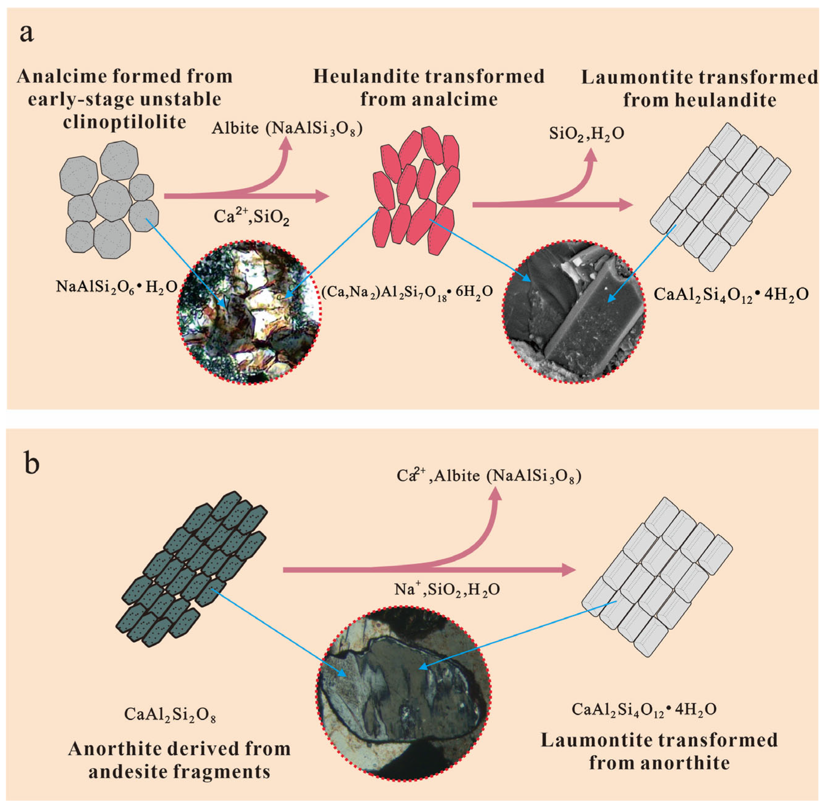 30. Huang, S.; Liu, J.; Song, L.; Wang, W. Thermodynamic explanation of the formation conditions of laumontite in the diagenesis of clastic rocks. Geol. Rev. 2001, 47, 301–308. [Google Scholar] [CrossRef]