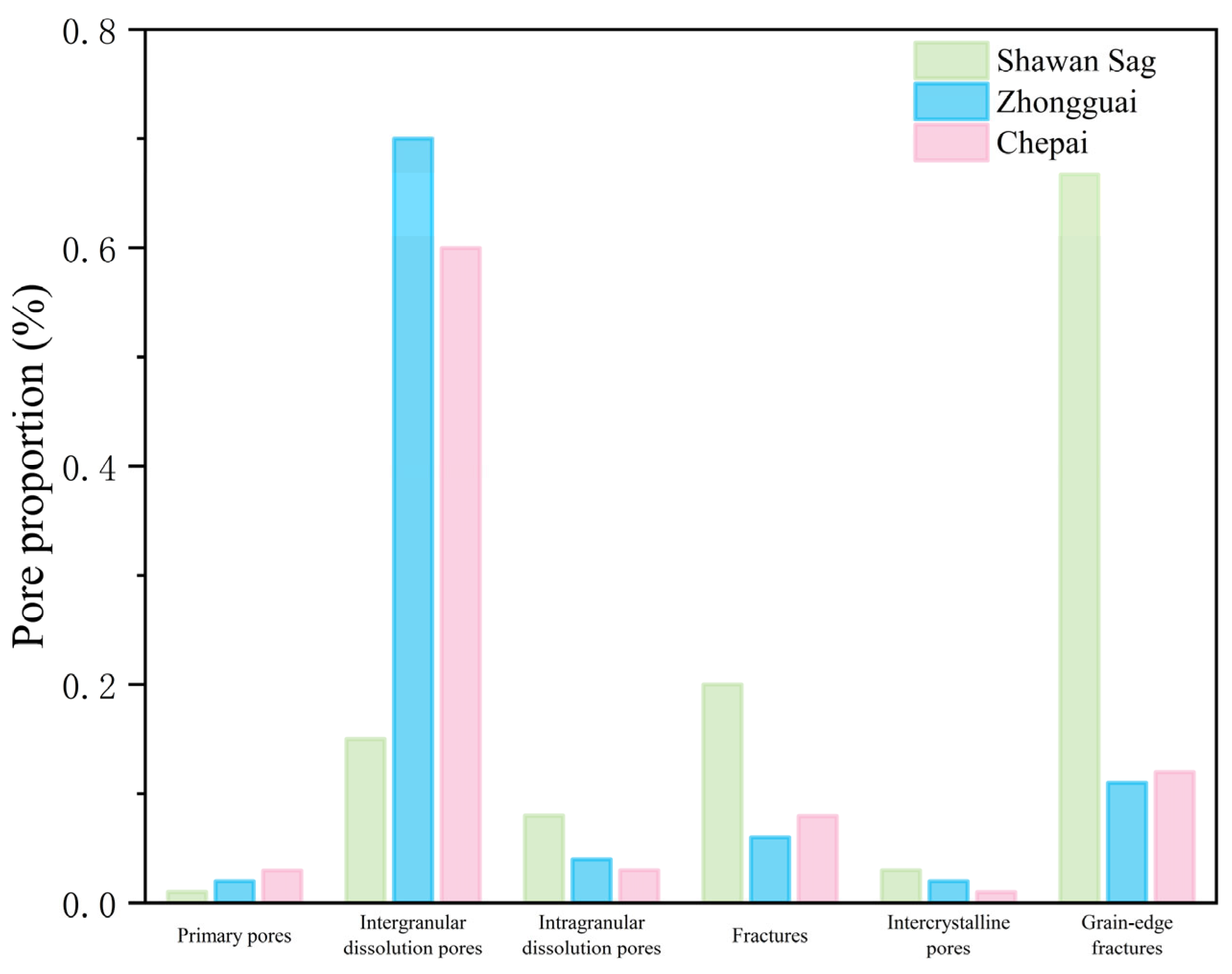 Figure 7. Contrast in pore types between the Shawan Sag and adjacent areas.