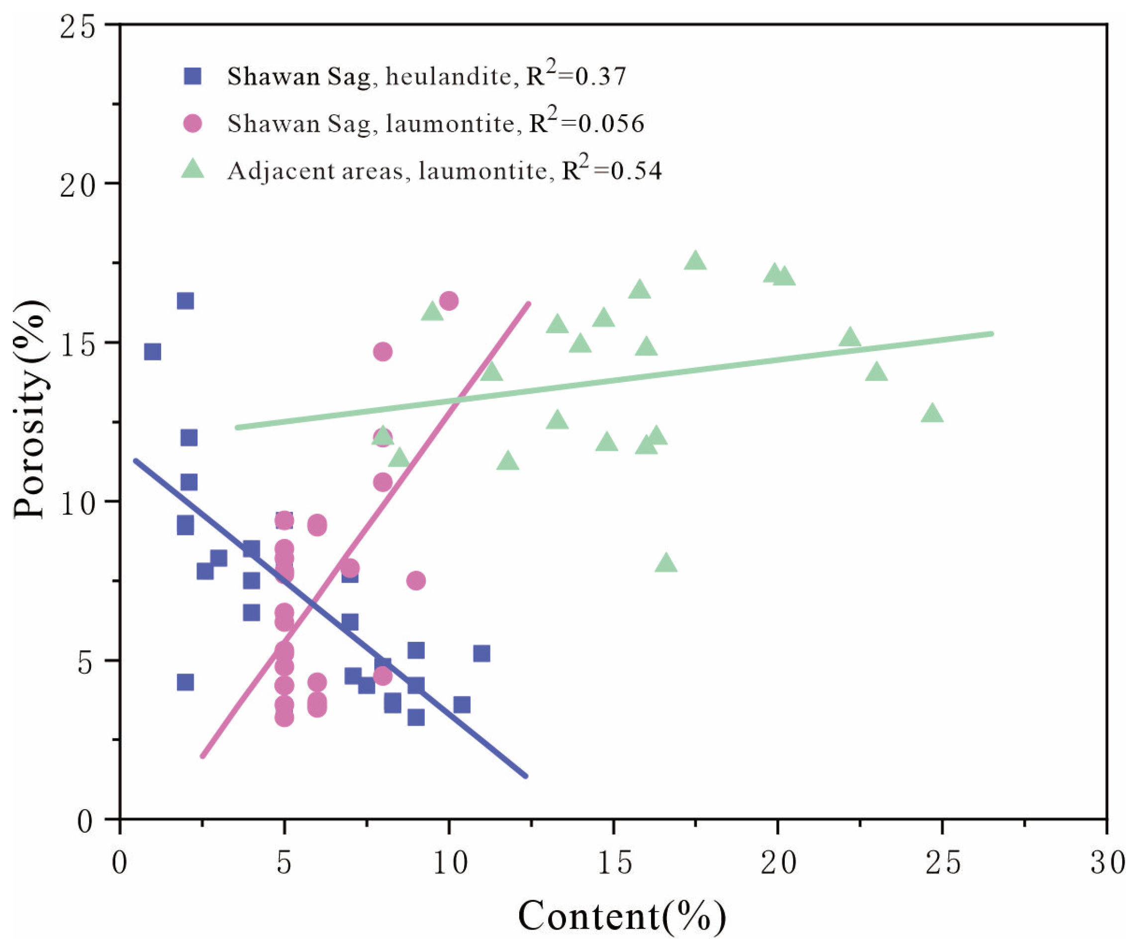 To investigate the controlling effect of zeolite cementation on reservoir quality, this study integrates thin-section point-counting data with petrophysical measurements. The integrated data reveal that the Shawan Sag is characterized by the co-occurrence of heulandite and laumontite (with average contents of approximately 7.5% and 6.0%, respectively), whereas adjacent areas are generally devoid of heulandite but contain higher abundances of laumontite (averaging ~15.0%), accompanied by comparatively higher porosity. As illustrated in Figure 10, laumontite content in the Shawan Sag is lower than in adjacent areas, and porosity further decreases with increasing heulandite content. Based on the genetic analysis of zeolites and supporting experimental evidence, we propose that heulandite, with its high Si/Al ratio, exhibits strong dissolution resistance. In contrast, laumontite, characterized by a low Si/Al ratio, is prone to transformation into soluble calcite. Consequently, higher laumontite content is conducive to the development of porosity in the reservoir.