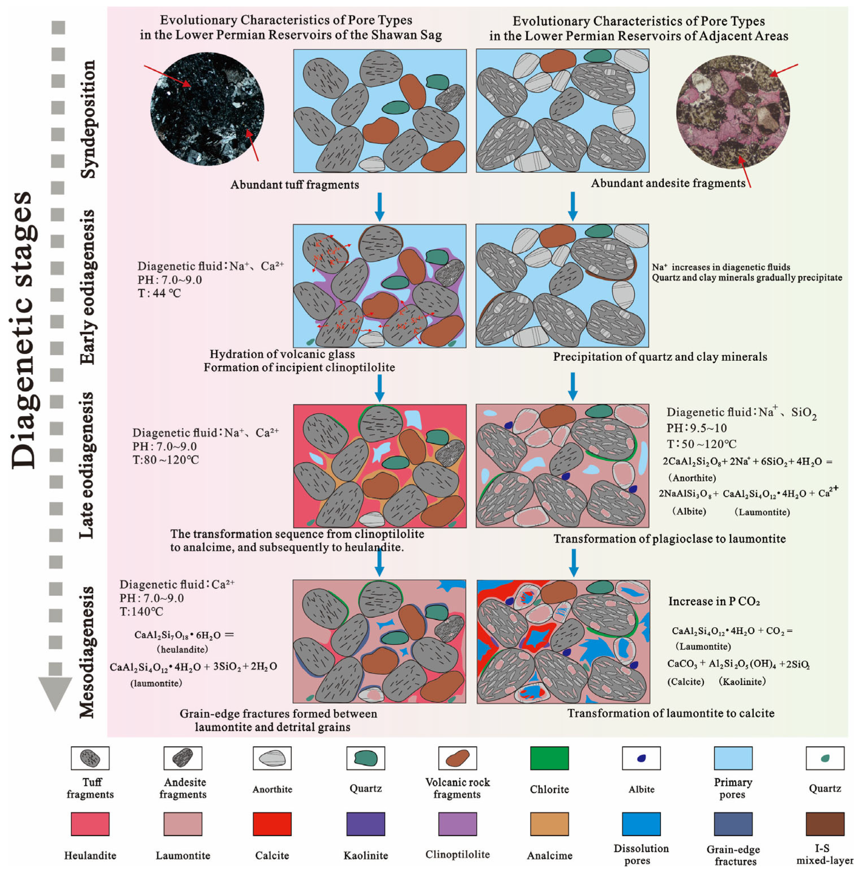 • Zeolite genetic differences between the Shawan Sag and adjacent areas shape pore system differentiation. In the Sag, zeolite evolution involves mineral density changes and crystalline water release, resulting in pore systems dominated by grain-edge fractures. In adjacent areas, the albitization of plagioclase and the transformation of laumontite to calcite provide the material basis for subsequent dissolution, resulting in a pore type dominated by intergranular dissolution pores. Provenance differences control both zeolite genesis mechanisms and pore type differentiation.