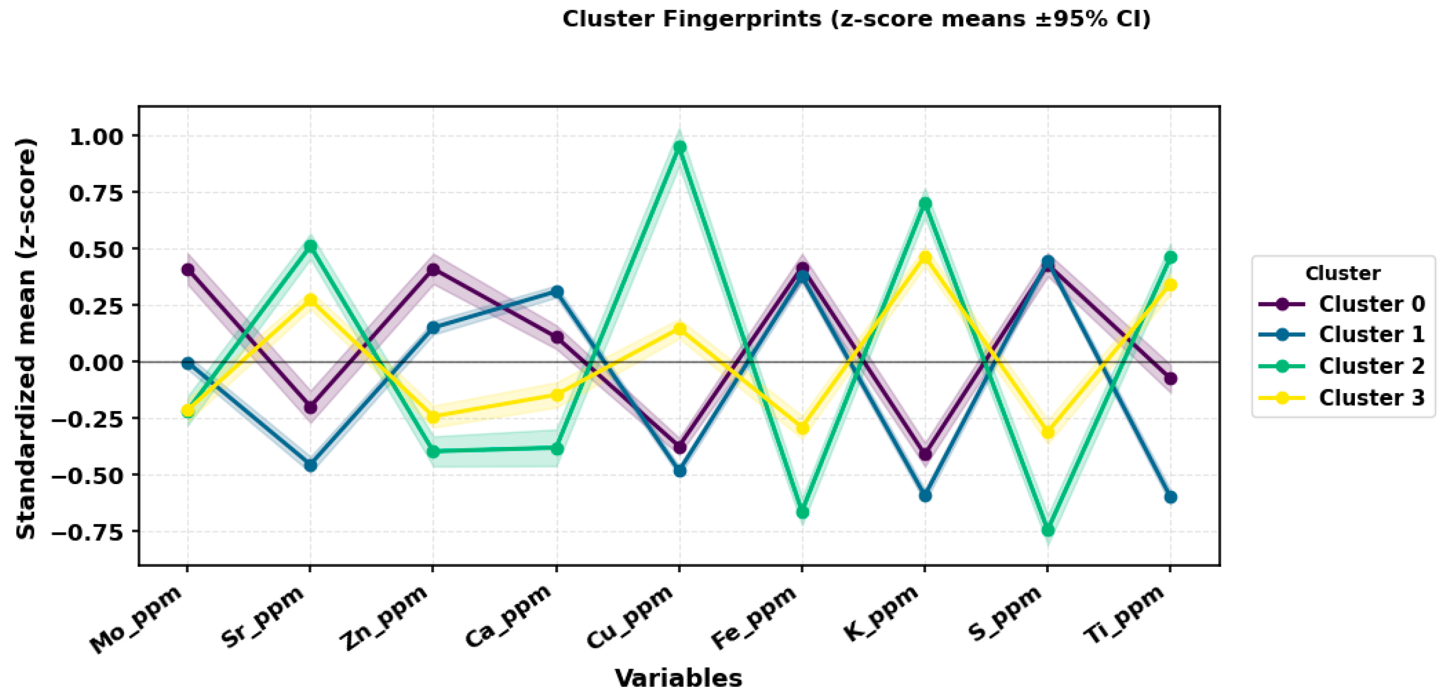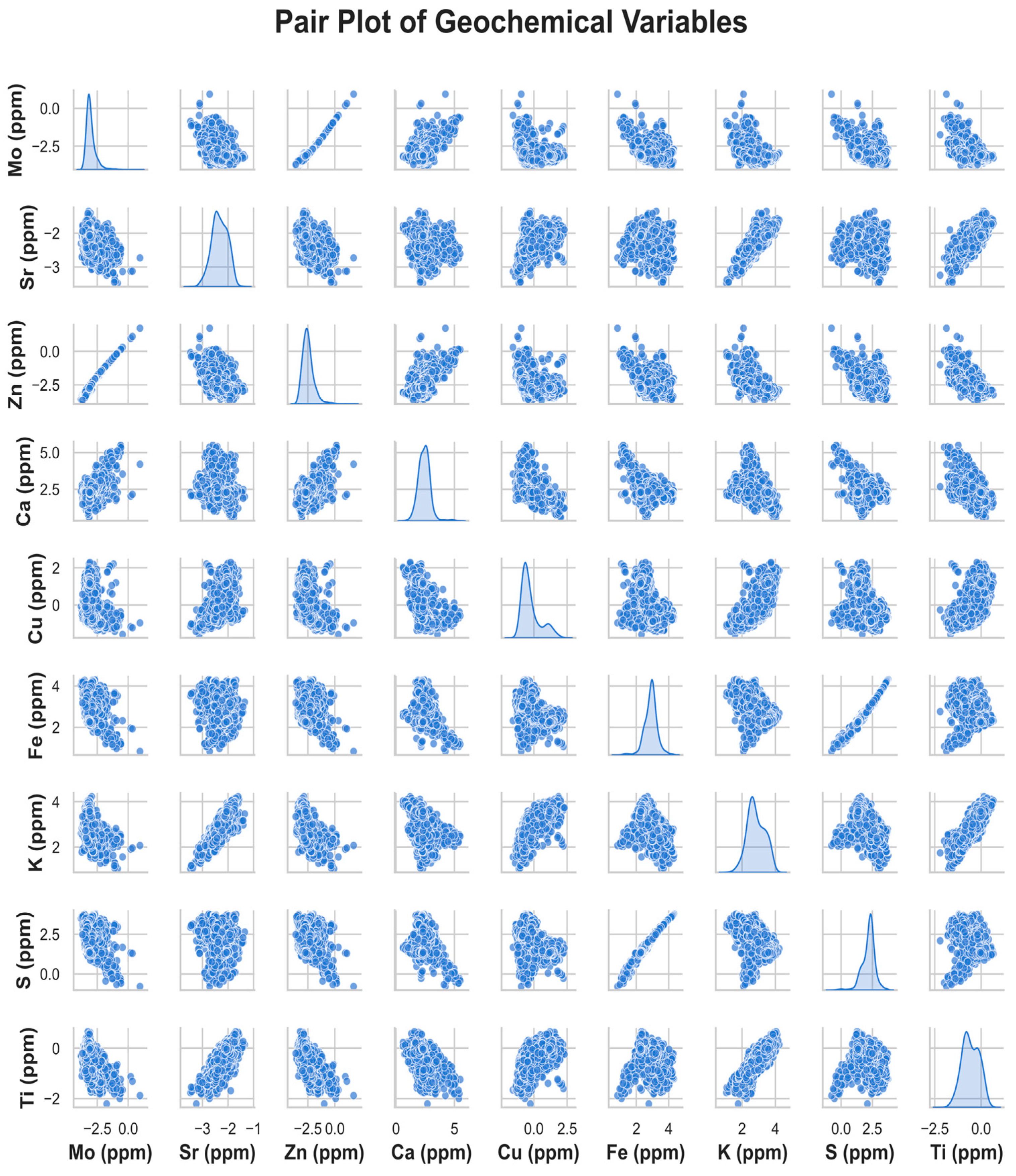 Nine elements were analyzed: molybdenum (Mo), strontium (Sr), zinc (Zn), calcium (Ca), copper (Cu), iron (Fe), potassium (K), sulfur (S), and titanium (Ti). All concentrations were measured in parts per million (ppm). Figure 1 presents a pair plot illustrating the distribution (diagonal histograms) and bivariate relationships (off-diagonal scatter plots) among these elements. The diagonal histograms indicate that Sr, Zn, and S have more pronounced tails, which suggests skewed or possibly multimodal distributions, whereas Ca and K appear closer to approximately normal behavior. The off-diagonal scatter plots show that Ti and Fe form relatively strong linear trends, which is consistent with shared mineralogical sources. In contrast, Cu and K display weaker correlations, which suggests more variable geochemical controls or the influence of multiple phases on their concentrations.