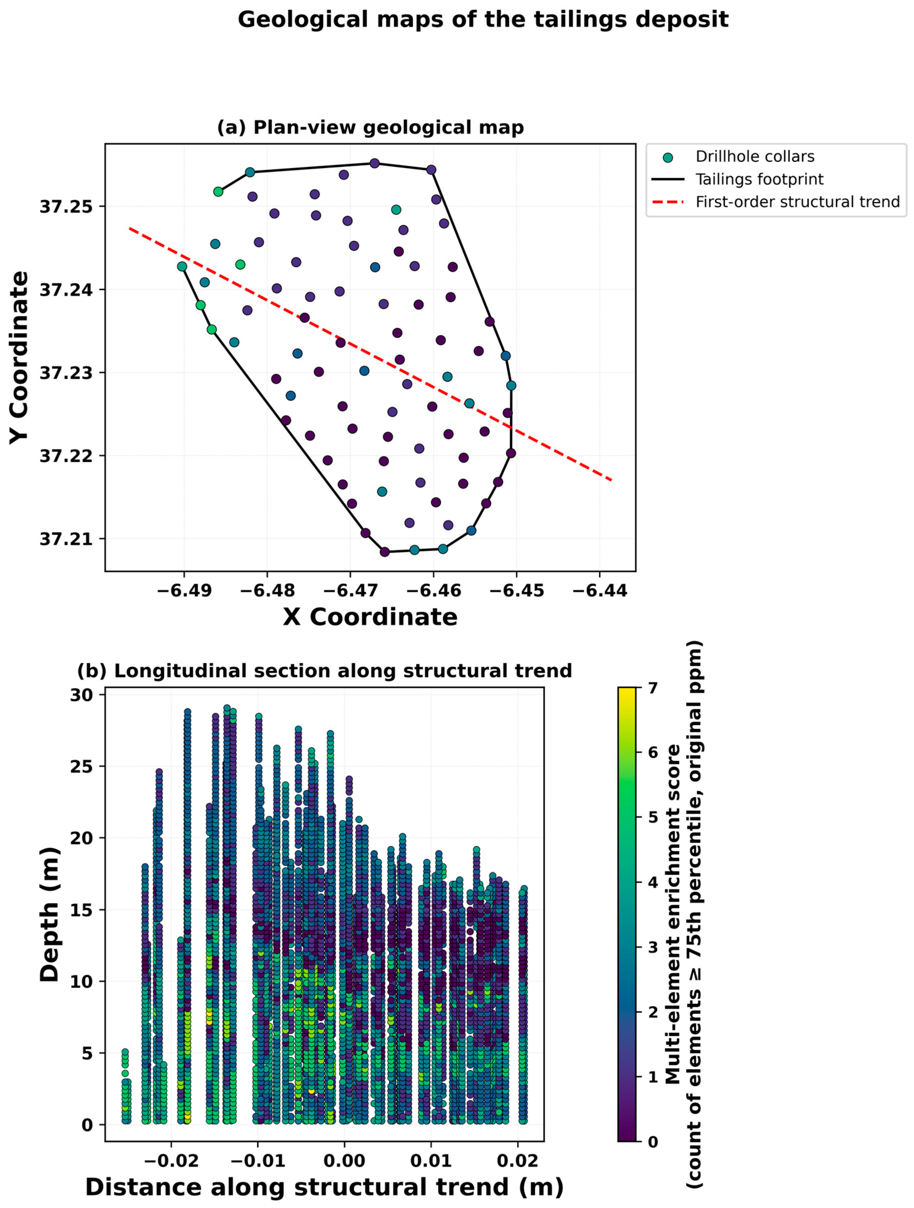 To place the drillhole dataset in its deposit scale context, Figure 2 shows geological maps of the tailing body in plan view and as a longitudinal section along the main structural trend. In the plan view, the tailing footprint is outlined and a first-order structural trend is inferred from the collar geometry. Each collar is colored by a multielement enrichment score that is computed from the original Mo to Ti assays and used as a qualitative indicator of local resource potential. The longitudinal section displays the same enrichment score as a function of distance along the trend and depth, which emphasizes the stacked and stratified character that is expected for operational tailing deposition. Together, these two views summarize the overall geometry, structural framework, and spatial distribution of potentially recoverable material in the study deposit.