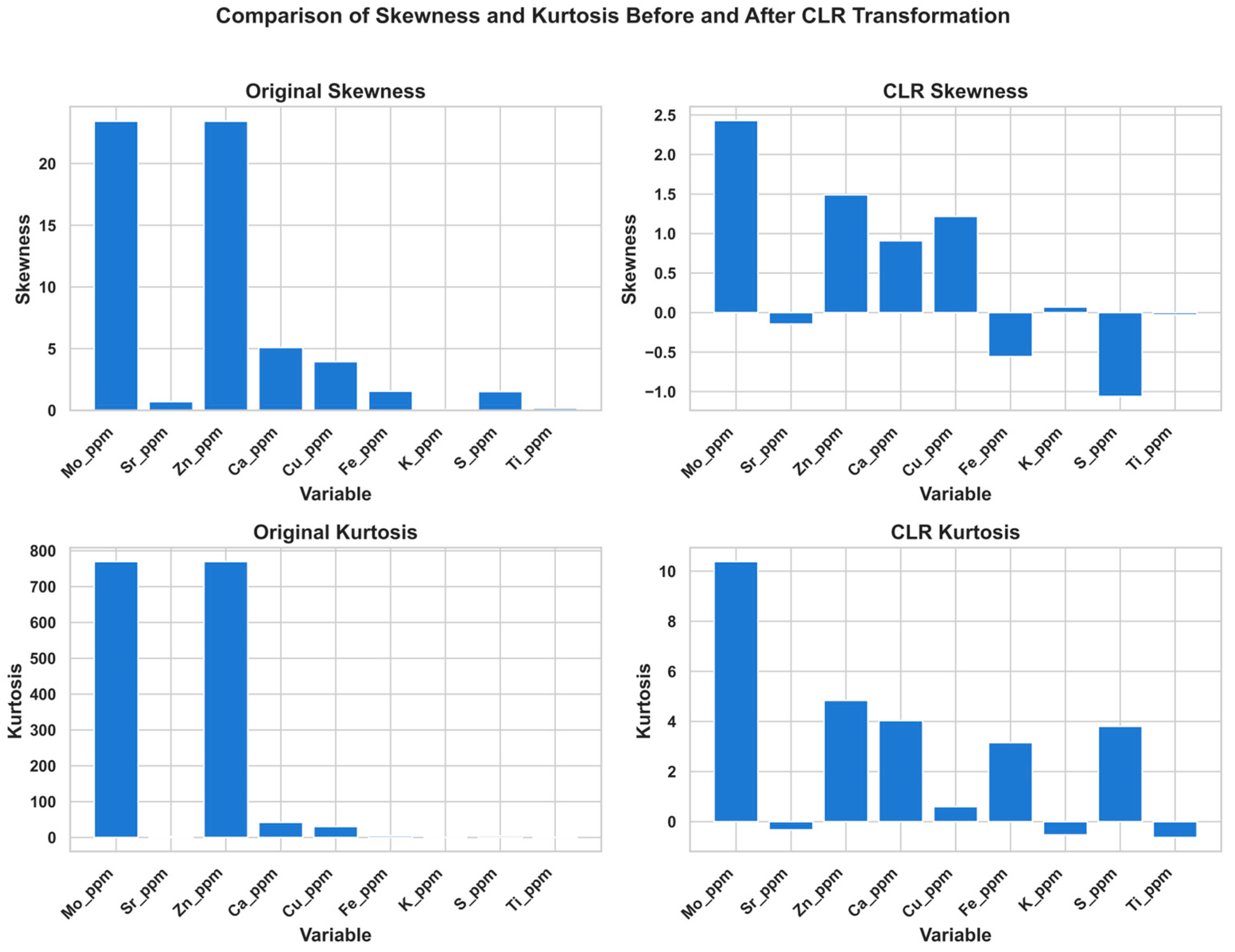 To clarify the statistical effect of compositional preprocessing, skewness and kurtosis were calculated for the nine geochemical variables before and after application of the centered log-ratio (CLR) transformation (Figure 3). In the original data, Mo, Zn, and Ca are strongly right-skewed and display extreme kurtosis, with Mo and Zn showing skewness values above 20 and kurtosis values greater than 750. Such heavy tails can distort standard multivariate analyses and clustering results. This behavior is characteristic of compositional datasets, in which an increase in one component implies a relative decrease in others and can introduce spurious correlations and misleading patterns in the untransformed space.
