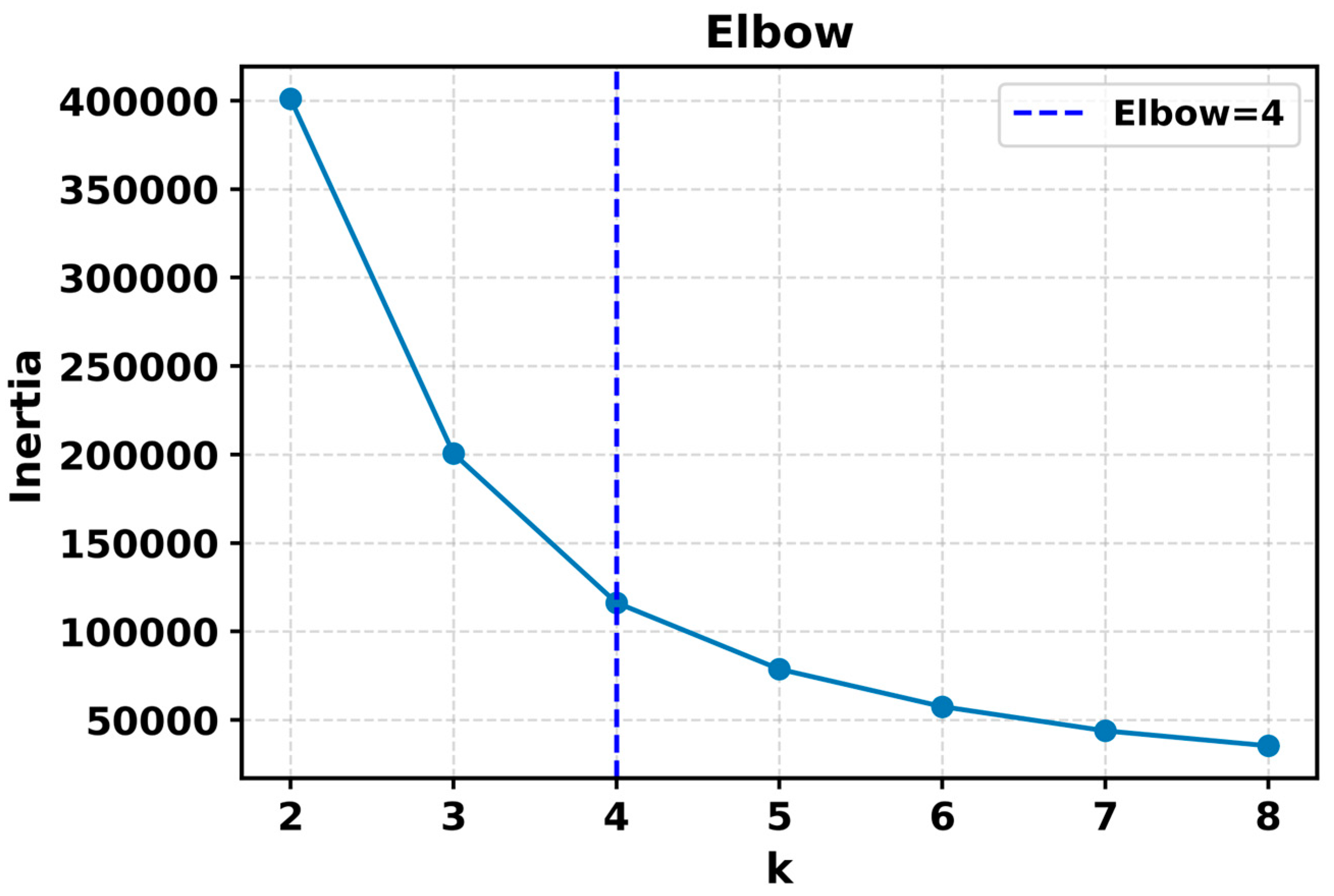 In practice, the number of clusters is varied from 1 up to a preselected maximum, and the corresponding values of I k   are computed for each k. These inertia values are then plotted against k to produce an elbow plot. The chosen value of k is taken at the point where the curve begins to flatten, so that further increases in the number of clusters yield only modest reductions in inertia and are therefore less likely to provide additional interpretive value.