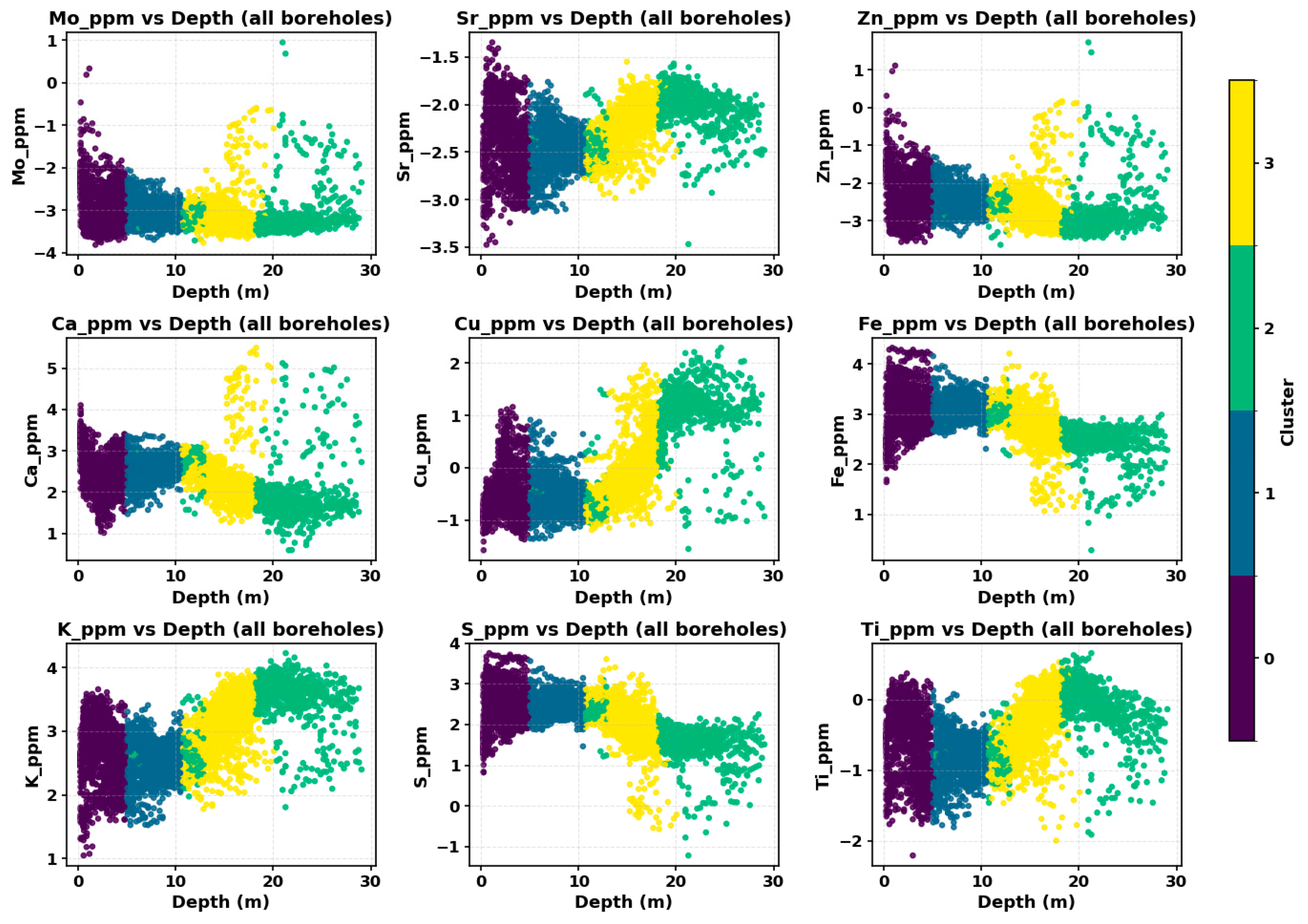 Downhole assays were first composited into uniform intervals. For each borehole, samples were sorted by depth and partitioned into contiguous left-closed intervals of 0.3 m that covered the sampled range. Elemental concentrations within each interval were then aggregated as depth-weighted means, using the recorded sample thicknesses, so that mass balance was preserved under irregular sampling. Across all boreholes, this procedure produced a single table of uniformly spaced 0.3 m slices that was used for consistent downstream analysis. Intervals with no observations were omitted in order to avoid the introduction of artificial values. Each composite retained its start, end, and midpoint depths so that the downhole chronology and spatial positioning remained clearly defined in subsequent stages of the workflow.