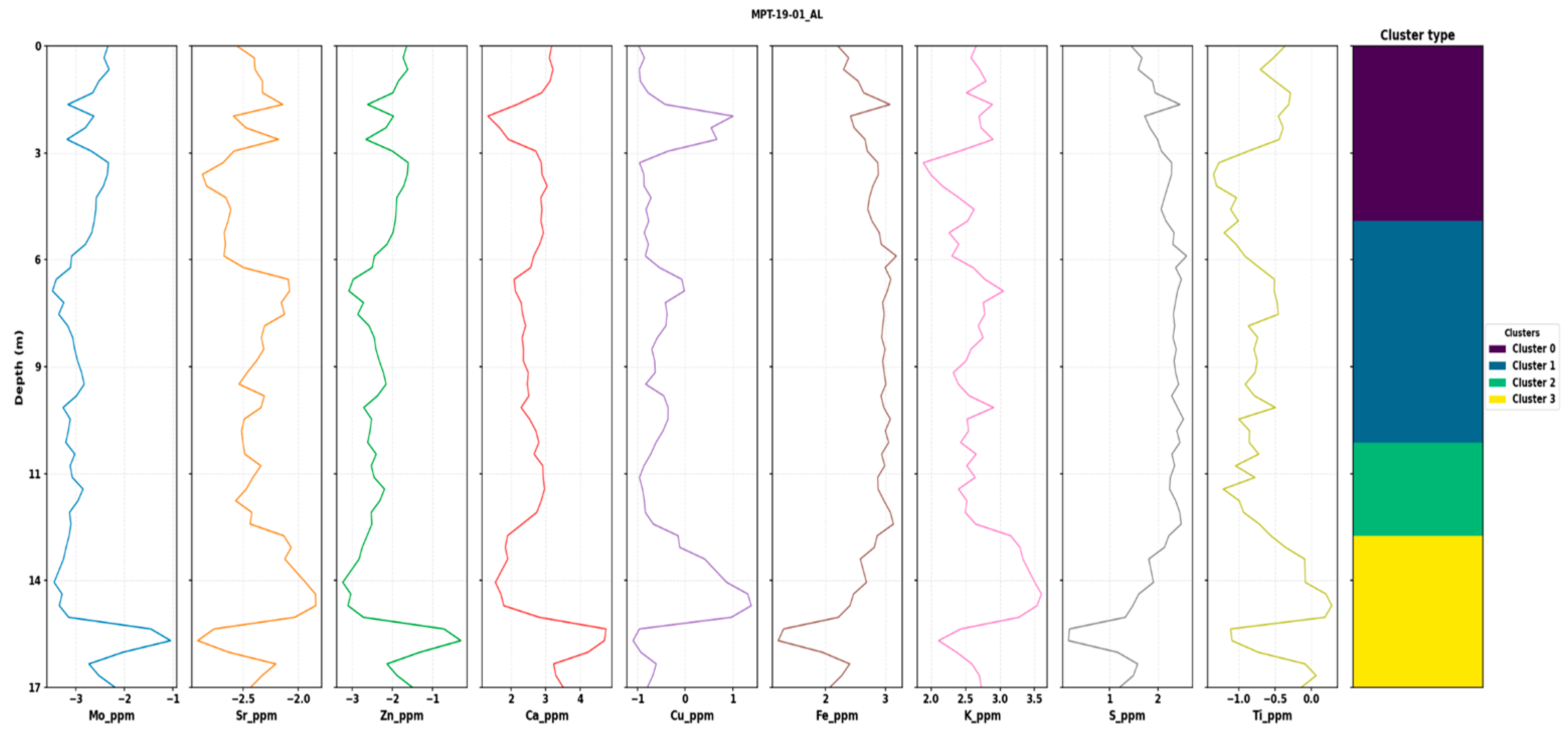Figure 7. Elemental depth profiles with cluster assignments (MPT-19-01_AL).