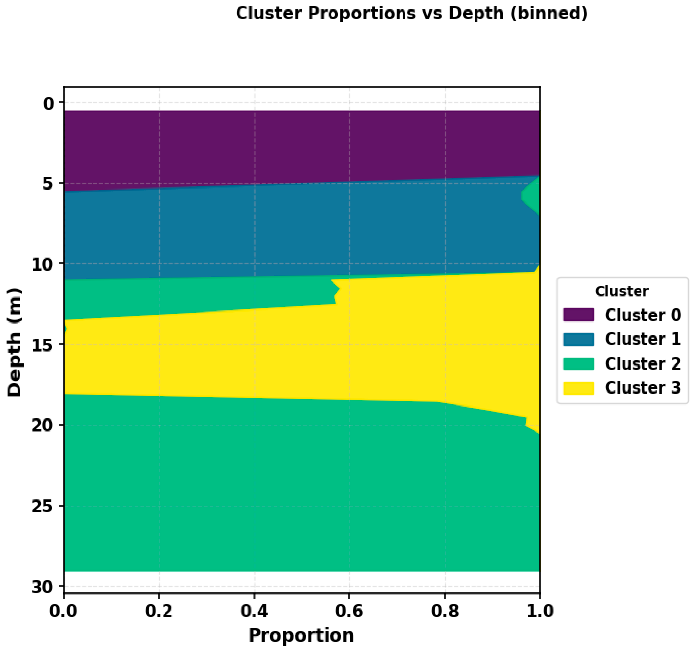 Figure 8. Zone proportions versus depth for the tailing deposit. Stacked ribbons were computed in 0.5 m bins; colors correspond to the final GkRNN zones; depth increases downward.