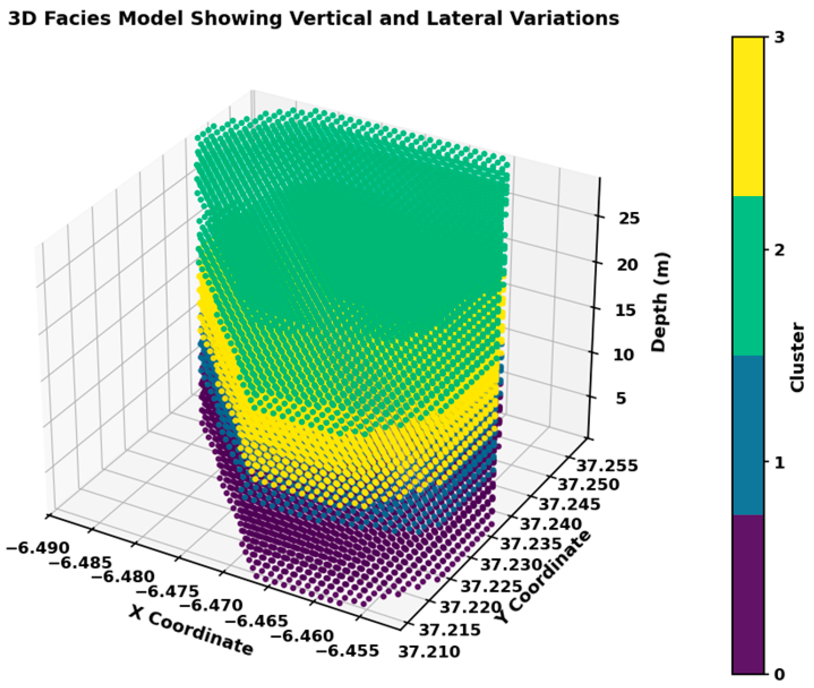 Figure 9. Three-dimensional facies model illustrating vertical and lateral variations within the borehole footprint. Colors indicate the final GkRNN zones.