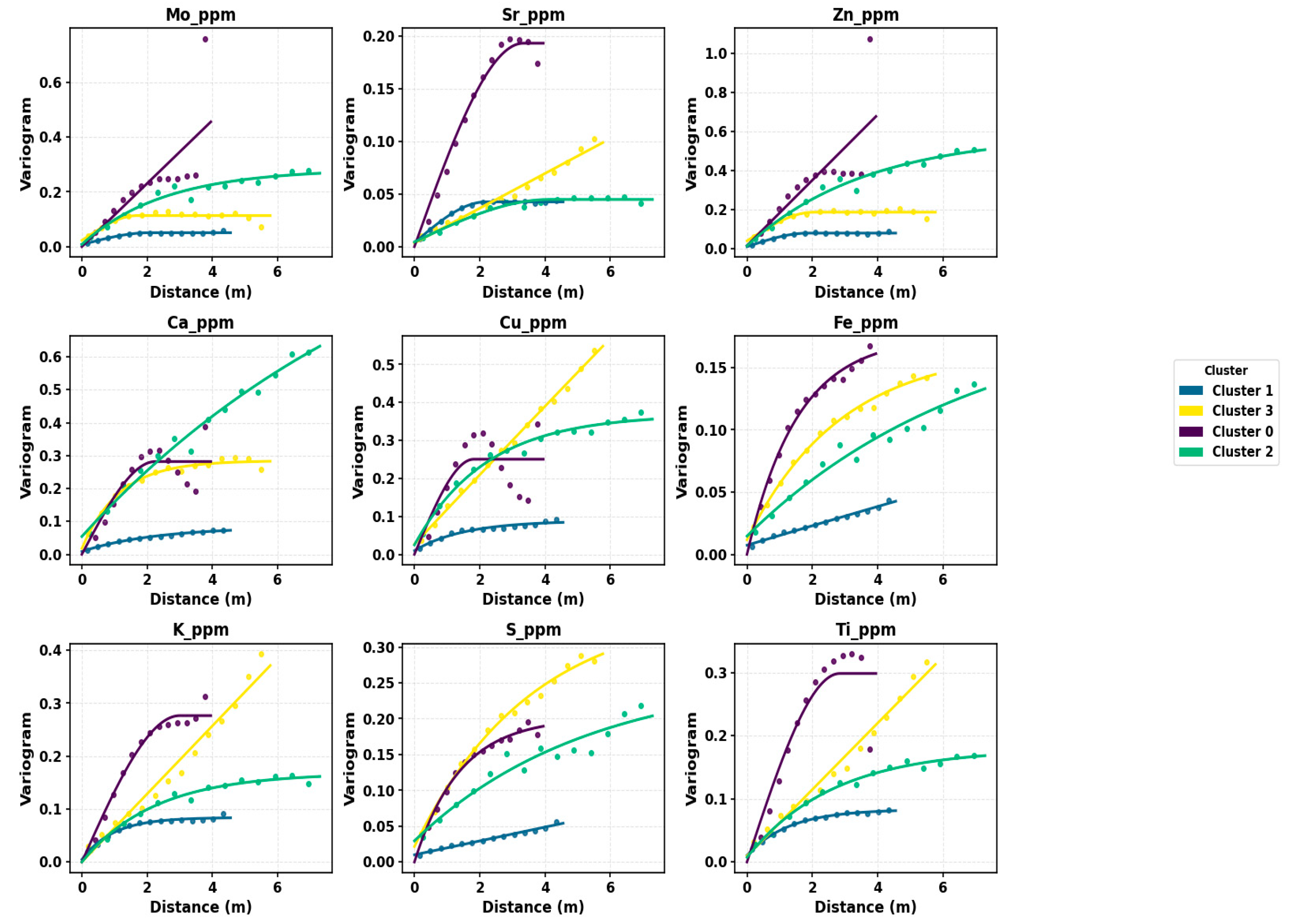 Although the case study uses nine elements, the GkRNN architecture are not tied to this dimensionality and can accommodate larger multivariate assays. Numerical stability is maintained by operating on standardized CLR variables, regularizing the variogram matrices (kernel smoothing and PSD correction), and projecting them into a fixed low-dimensional spectral space for clustering and sequence learning. The main practical requirement is that the number of samples remains sufficiently larger than the number of variables for reliable variogram and emission estimation, and very high-dimensional assays may be screened or reduced without changing the model structure.