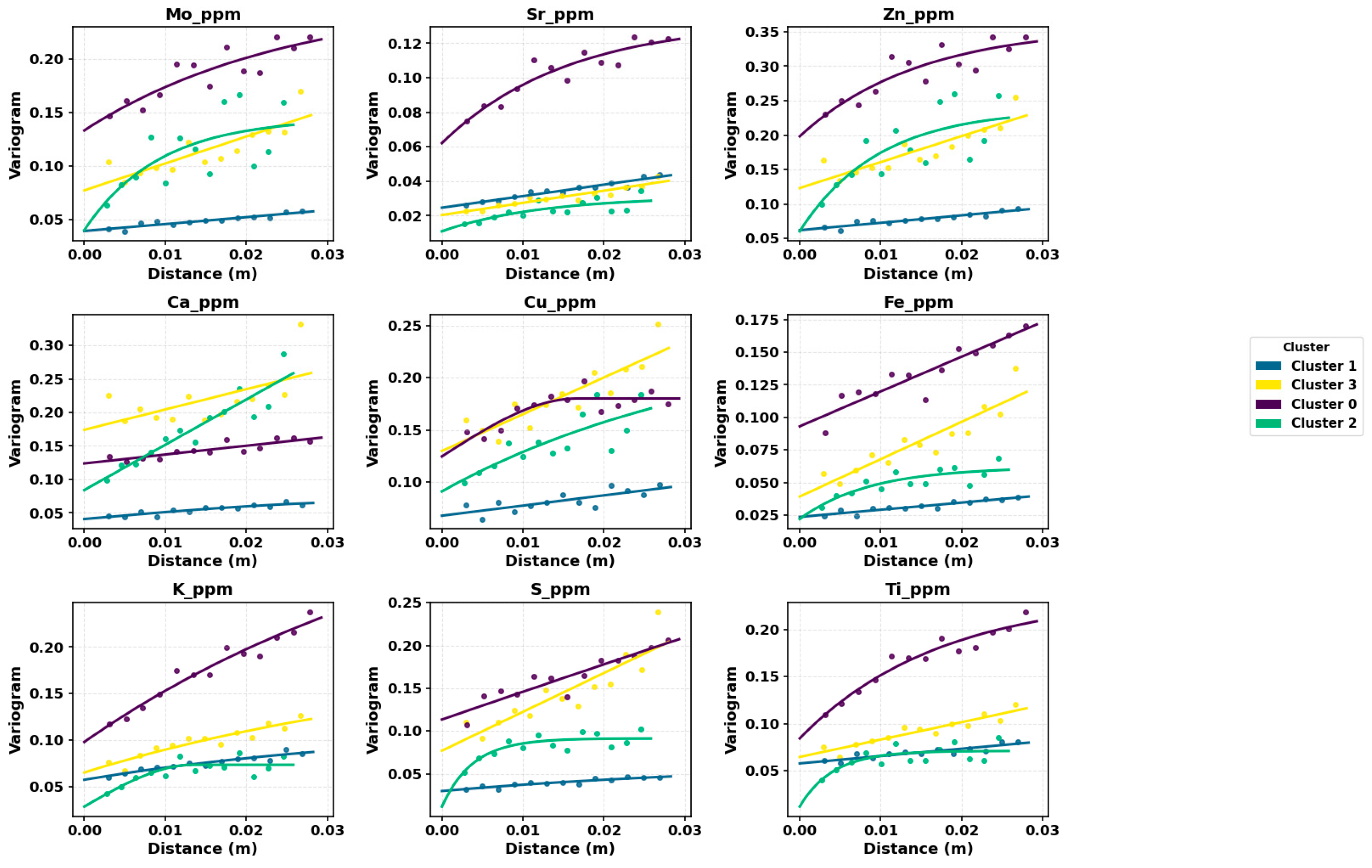 In the next stage, joint spatial continuity is characterized. Direct and cross variograms of the CLR variables are used to construct a lag-dependent variogram matrix, which is converted into a similarity measure. A simple spatial proximity term is added so that samples that are close together in space retain a strong relationship. A spectral embedding of the resulting affinity matrix provides a compact set of coordinates that summarize joint continuity. An elbow analysis on these coordinates is then used to select a parsimonious number of clusters k, and k-means clustering in the embedded space yields provisional labels that already reflect both geochemical affinity and lateral context.