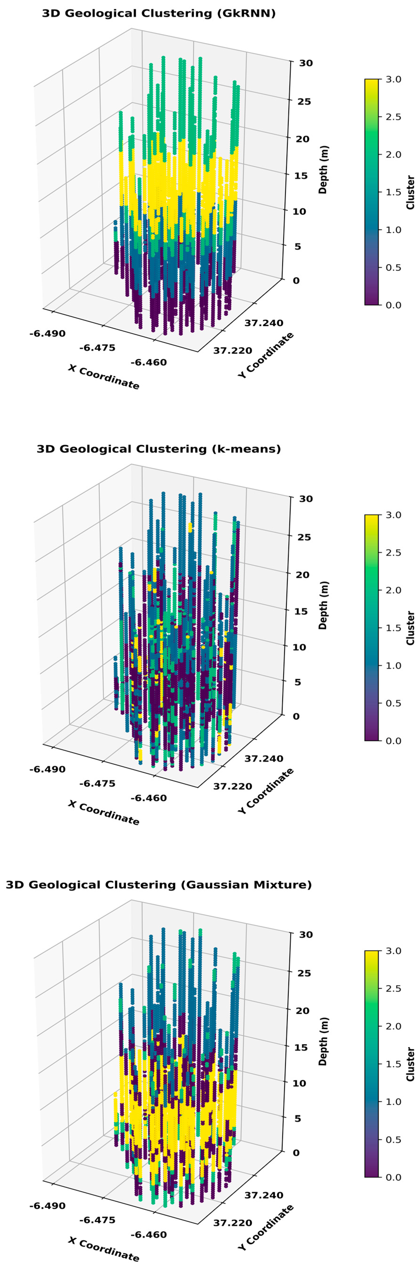 Figure 13. Three-dimensional geological visualization of clustered facies generated using (top) the continuity-aware GkRNN workflow, (middle) k-means clustering, and (bottom) Gaussian Mixture models. Each plot shows drillhole trajectories colored by the assigned cluster labels, with depth plotted along the vertical axis.