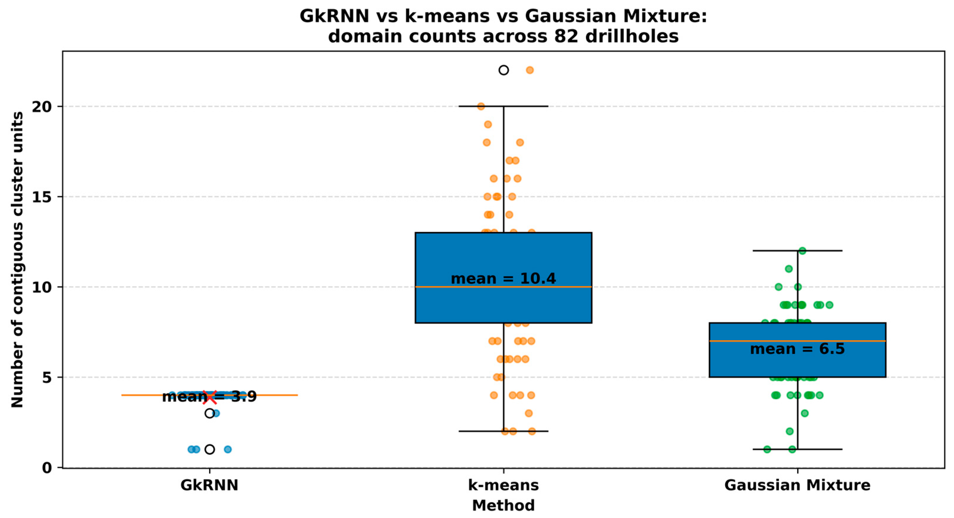 Figure 14. Boxplot comparing the number of contiguous cluster units per drillhole for GkRNN, k-means, and Gaussian Mixture.