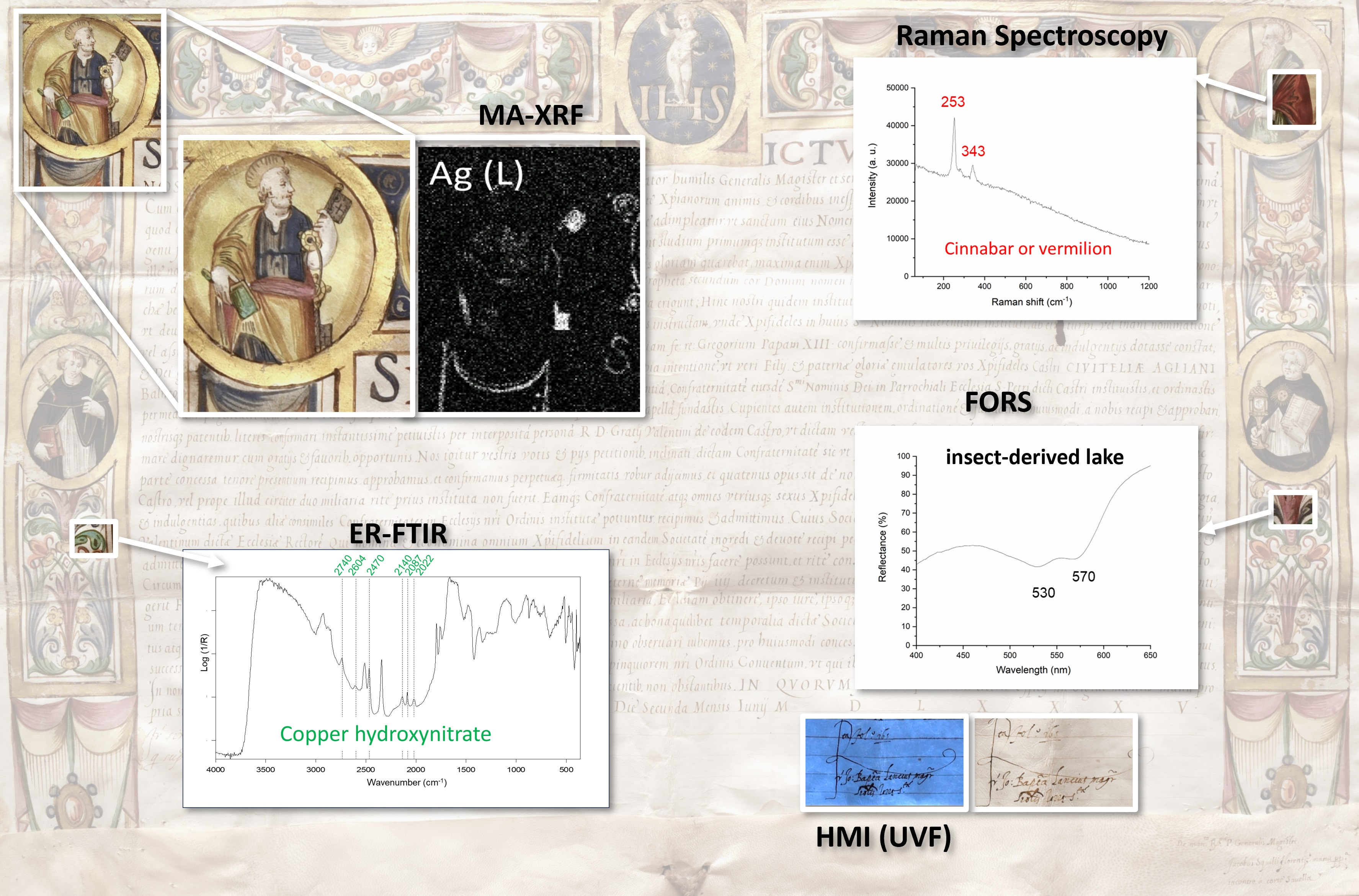 Pronti, L.; Romani, M.; Lanteri, L.; Bizzarri, F.; Colantonio, C.; Pelosi, C.; Ruberto, C.; Castelli, L.; Mazzinghi, A.; Spizzichino, V.; et al. Non-Invasive Investigation of a 16th-Century Illuminated Scroll: Pigments, Fillers, and Metal-Based Decorations. Minerals 2025, 15, 1252. https://doi.org/10.3390/min15121252