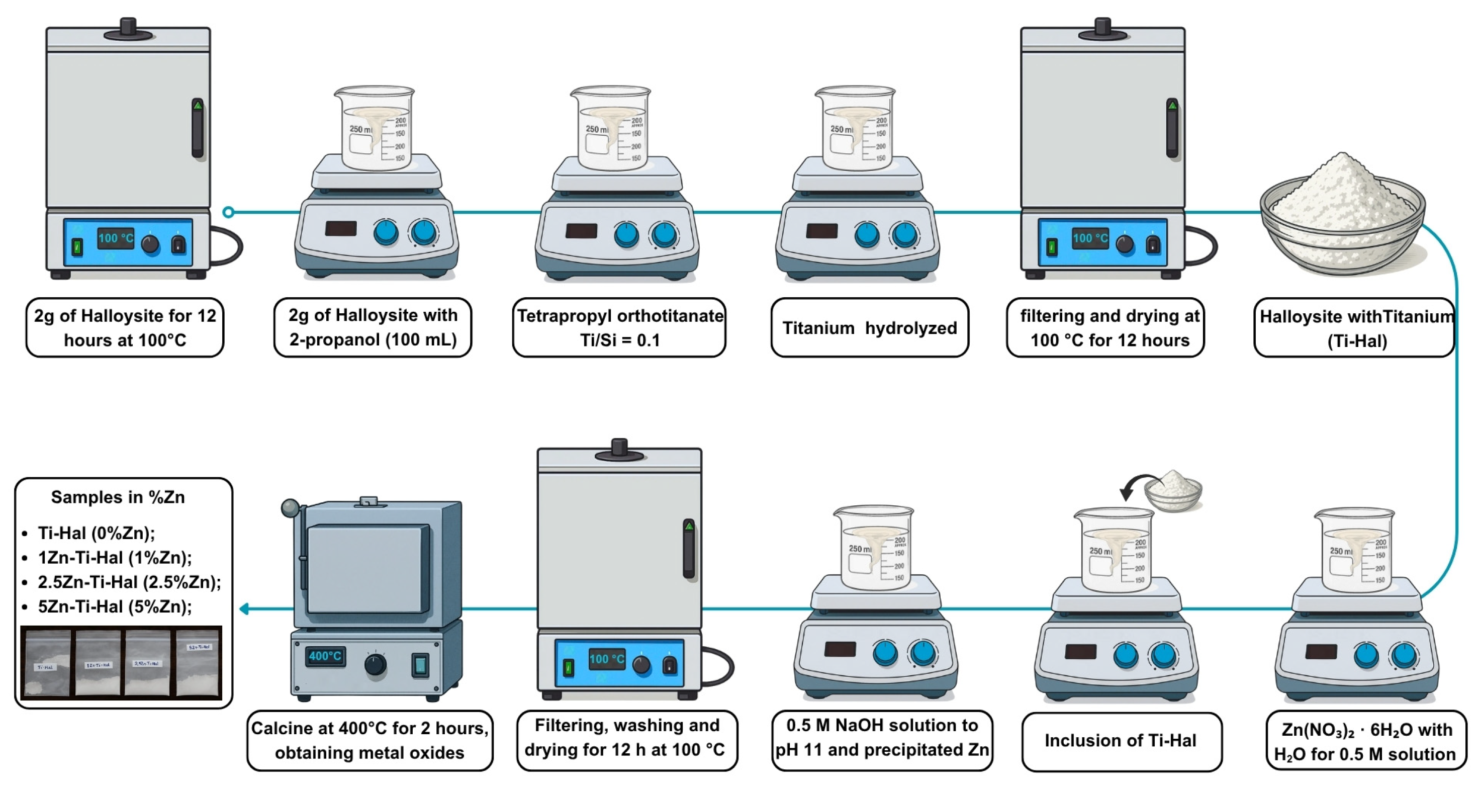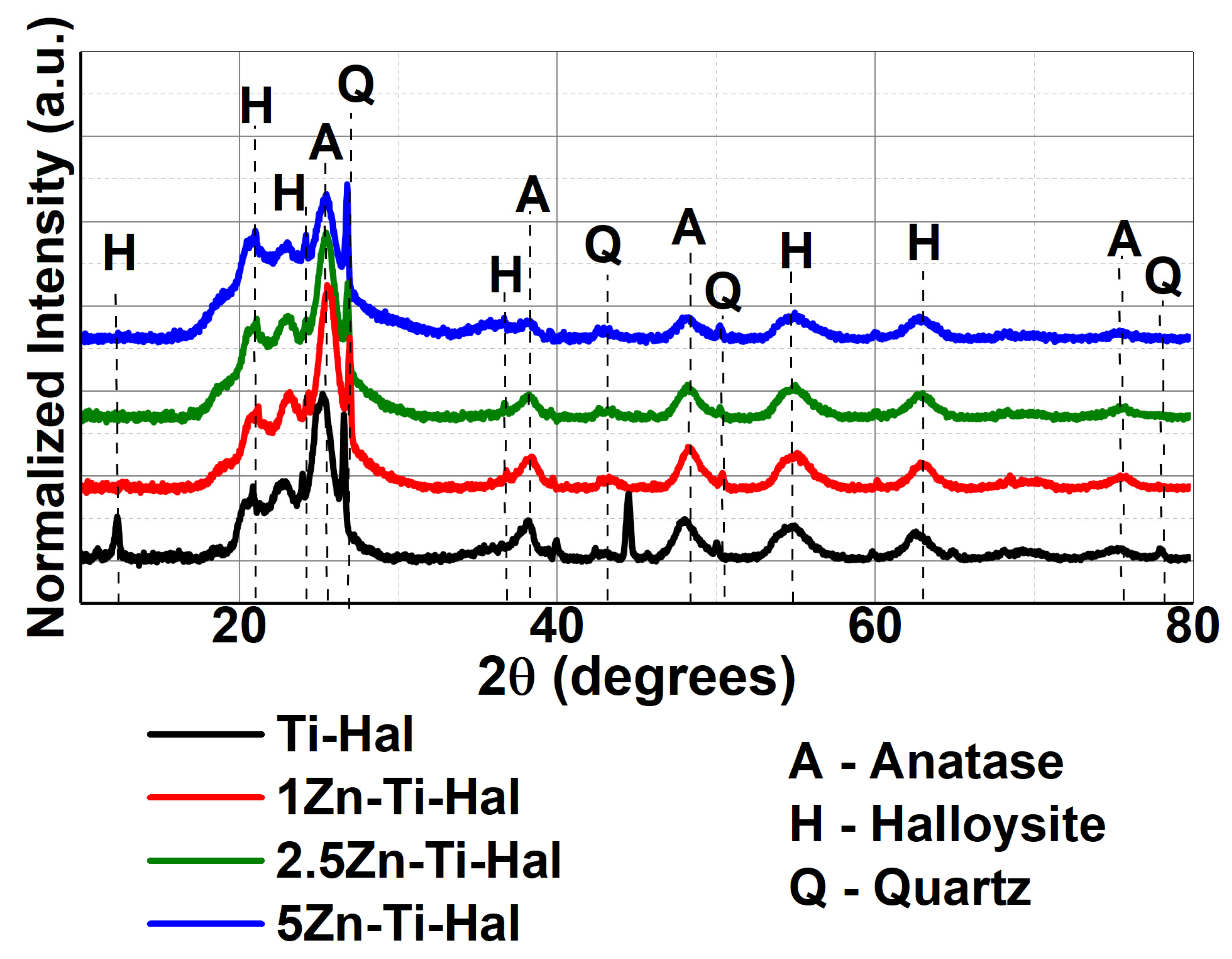- Yu, H.; Xu, H.; Hao, T.; Yuan, Y.; Zhang, B.; Wang, H.; Shao, G.; Fan, B.; Lu, H. Facile Synthesis of ZnO/Halloysite Nanotube Composite with Greatly Enhanced Photocatalytic Performance. Colloids Surf. A Physicochem. Eng. Asp. 2024, 688, 133633. [Google Scholar] [CrossRef]