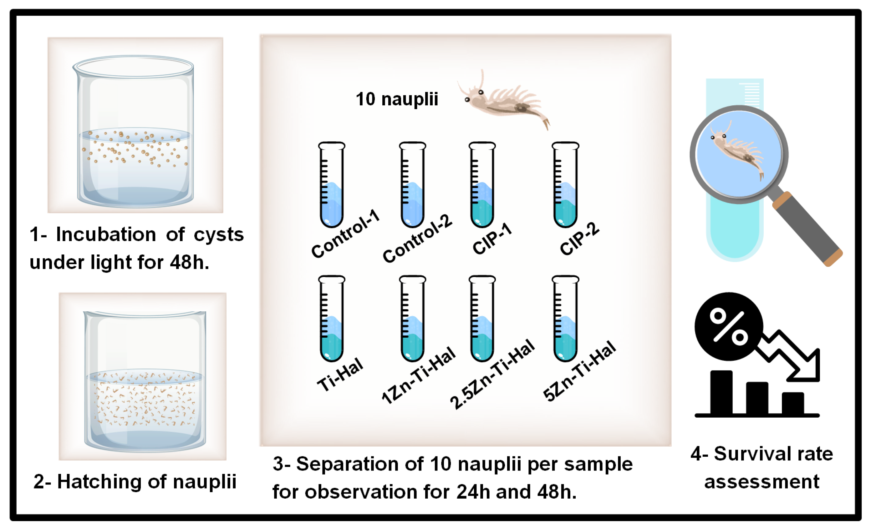 - Banti, C.; Hadjikakou, S. Evaluation of Toxicity with Brine Shrimp Assay. Bio-protocol 2021, 11, e3895. [Google Scholar] [CrossRef]