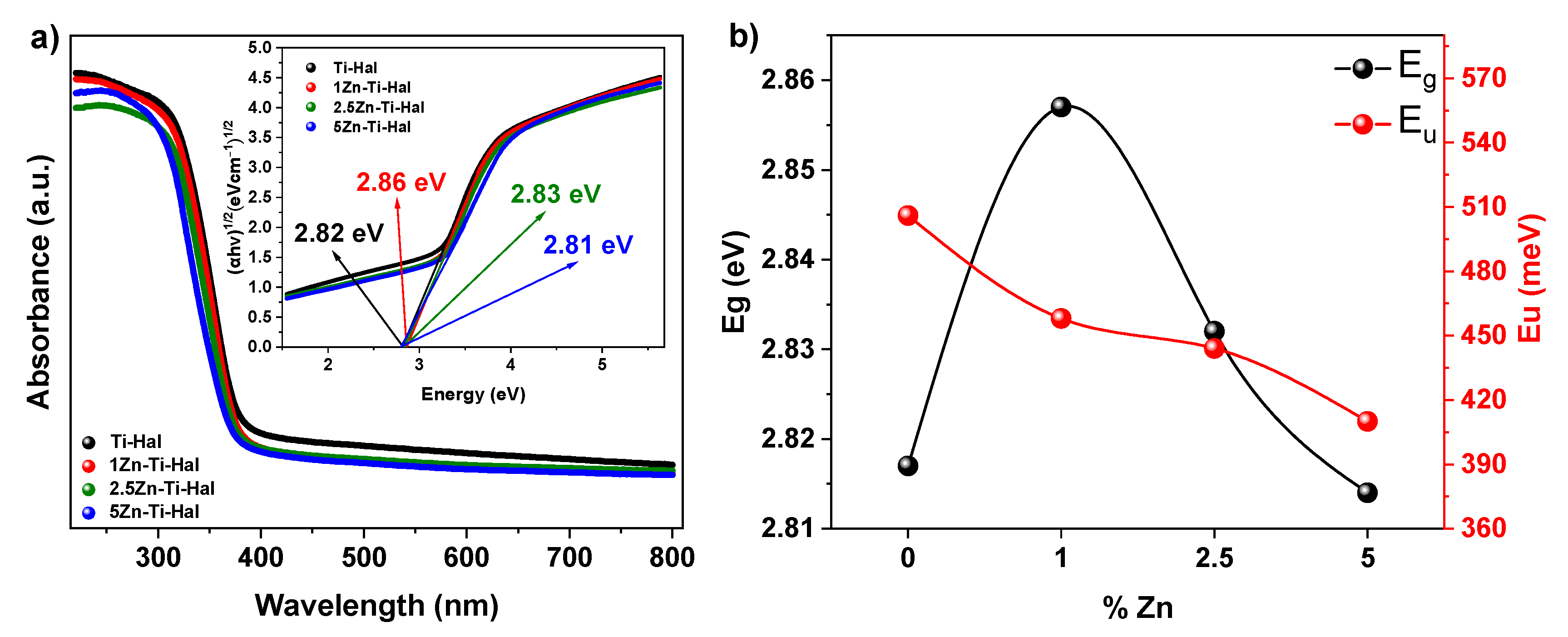 - Janani Archana, K.; Christy Preetha, A.; Balasubramanian, K. Influence of Urbach Energy in Enhanced Photocatalytic Activity of Cu Doped ZnO Nanoparticles. Opt. Mater. 2022, 127, 112245. [Google Scholar] [CrossRef]