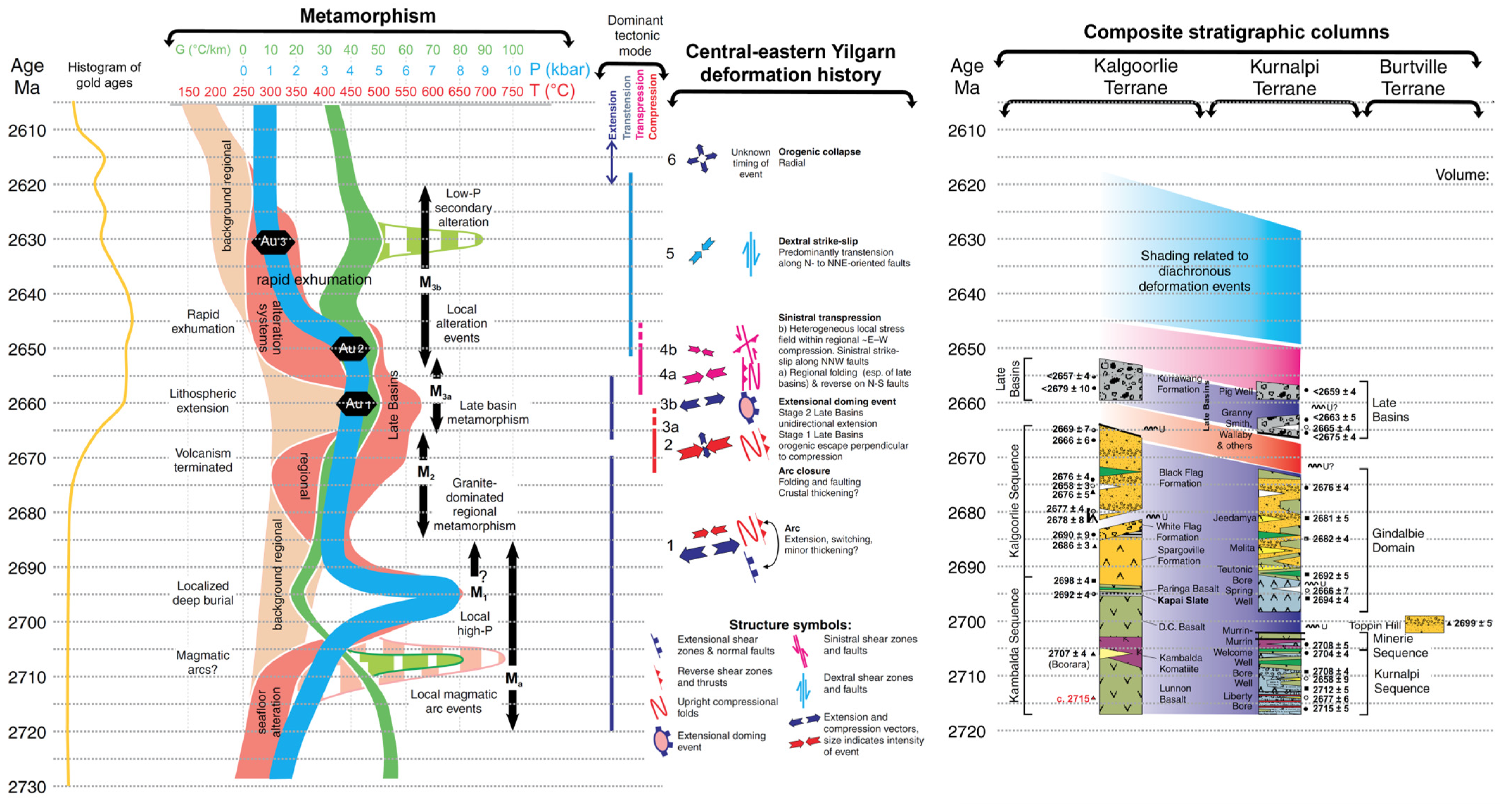 - Ma (>2750 Ma): Early, low-P/high-T upper-amphibolite to granulite facies assemblages are rare, restricted to magmatic arc-related ~2730 to 2810 Ma greenstone sequences in the western Burtville Terrane, and to HFSE granites and ~2675 to 2715 Ma greenstones of similar affinity in the Gindalbie Domain of the Kurnalpi Terrane.