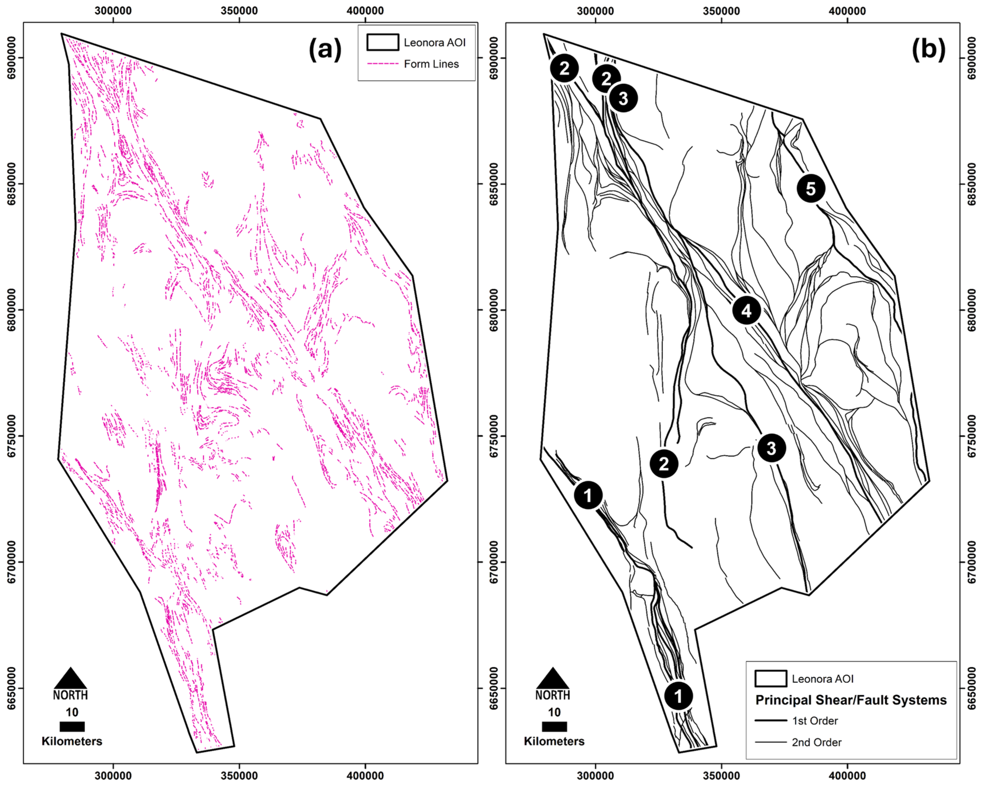 - D5 (~2650–2635 Ma): A subsequent stress field reorientation induced NE-SW-directed shortening accompanied by dextral strike–slip, thrusting, and low-Ca granite emplacement. Gold mineralization was primarily controlled by brittle structures. A key D5 deposit is Sunrise Dam (>10.3 Moz Au), located ~20 km east of the study area.