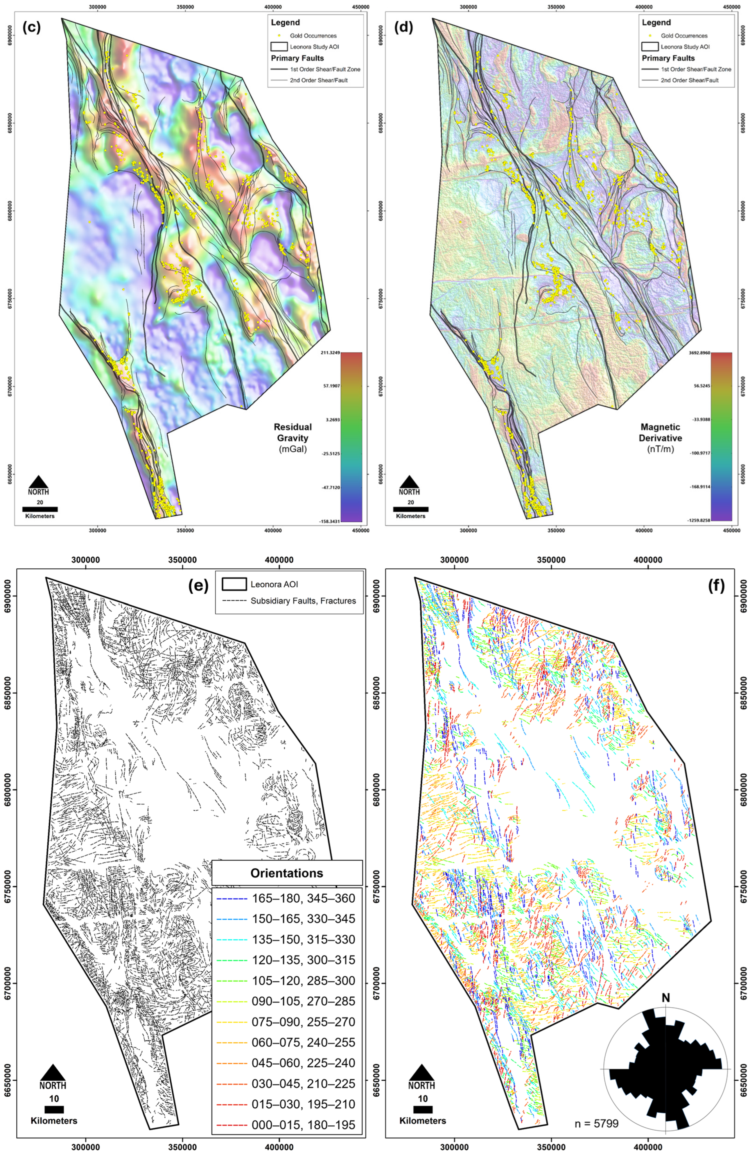 - Mineral potential modeling (MPM): Five complementary techniques were applied, with the random forest (RF) model performing best and detecting ~84% of known deposits while reducing the prospective search area to <8% of the total. Key predictive variables included proximity to (i) gravity ridges and edges, (ii) cross-structure density, (iii) alteration indices (high K/Th, Fe-oxide-clay ratios), (iv) greenstone belts, and (v) internal granitoid margins. Several underexplored, highly prospective corridors were delineated, particularly along concealed gravity-defined trends.