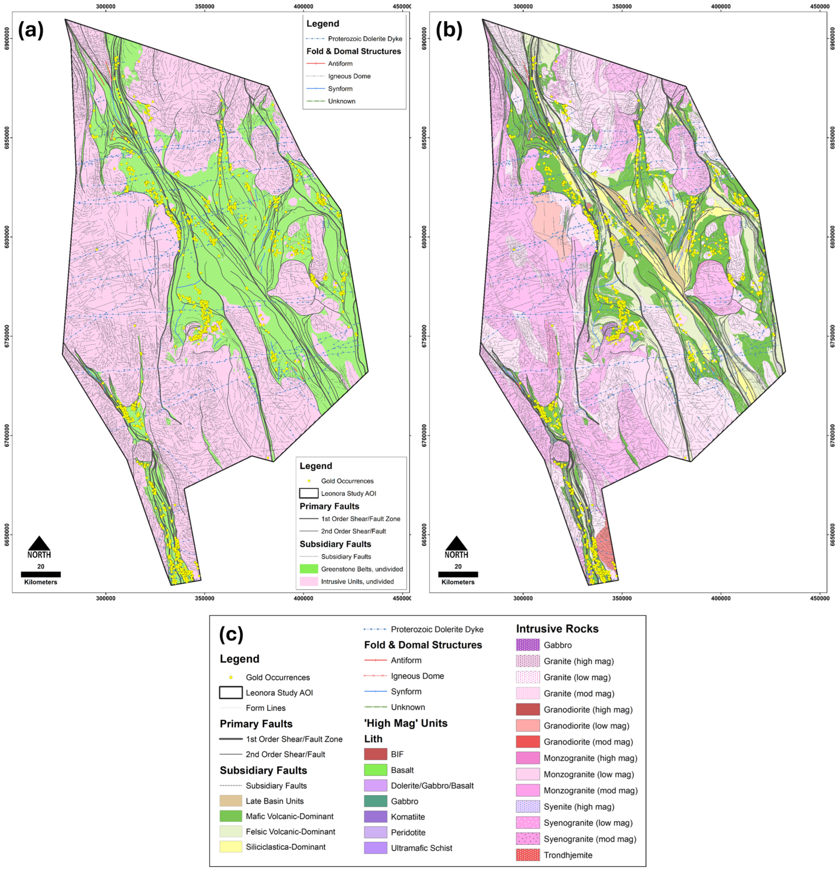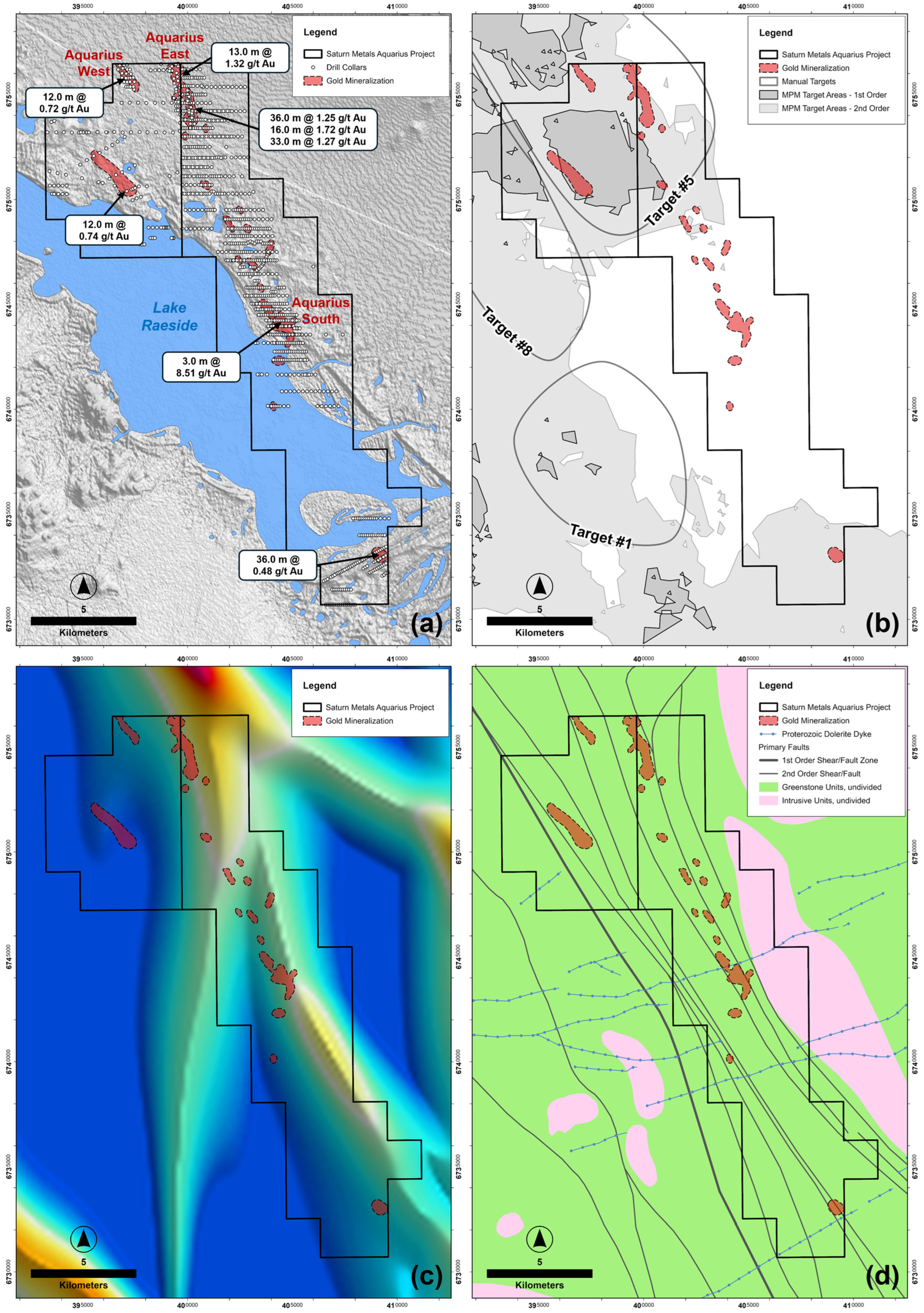 - Target #1: This target covers a cluster of poorly tested intrusions of the McAuliffe Well Syenite, which intruded mafic volcanic-dominated greenstone sequences, abut the first-order Keith–Kilkenny fault system, and are crosscut by E-W- to NW-SW-striking dolerite dykes. Shallow rotary air blast (RAB) drilling by Saracen Gold Mines Proprietary Limited (maximum hole depth of 45 m) returned intercepts of up to 1.00 m @ 12.28 g/t Au from 9.00 m (hole YER143), 1.00 m @ 6.94 g/t Au from 10.00 m (hole YER158), and 2.00 m @ 2.20 g/t Au from 9.00 m (hole YER159), defining surficial, saprolite-hosted gold mineralization over an area of ~400 × 300 m at the Dingo prospect. The nearby Bull Terrier prospect returned intercepts of 16.00 m @ 2.59 g/t Au from 105.00 m (hole YBD-2) and 16.00 m @ 1.52 g/t Au from 60.00 m, including 1.00 m @ 211.70 g/t Au from 65.00 m (hole YRC-63) [164,165]. No deeper or more systematic exploration drilling appears to have been undertaken across the McAuliffe Well Syenite intrusive cluster. Moreover, the area is held by several exploration companies, and this fragmented ownership, apparently persisting for decades, has likely hindered a more integrated exploration approach.