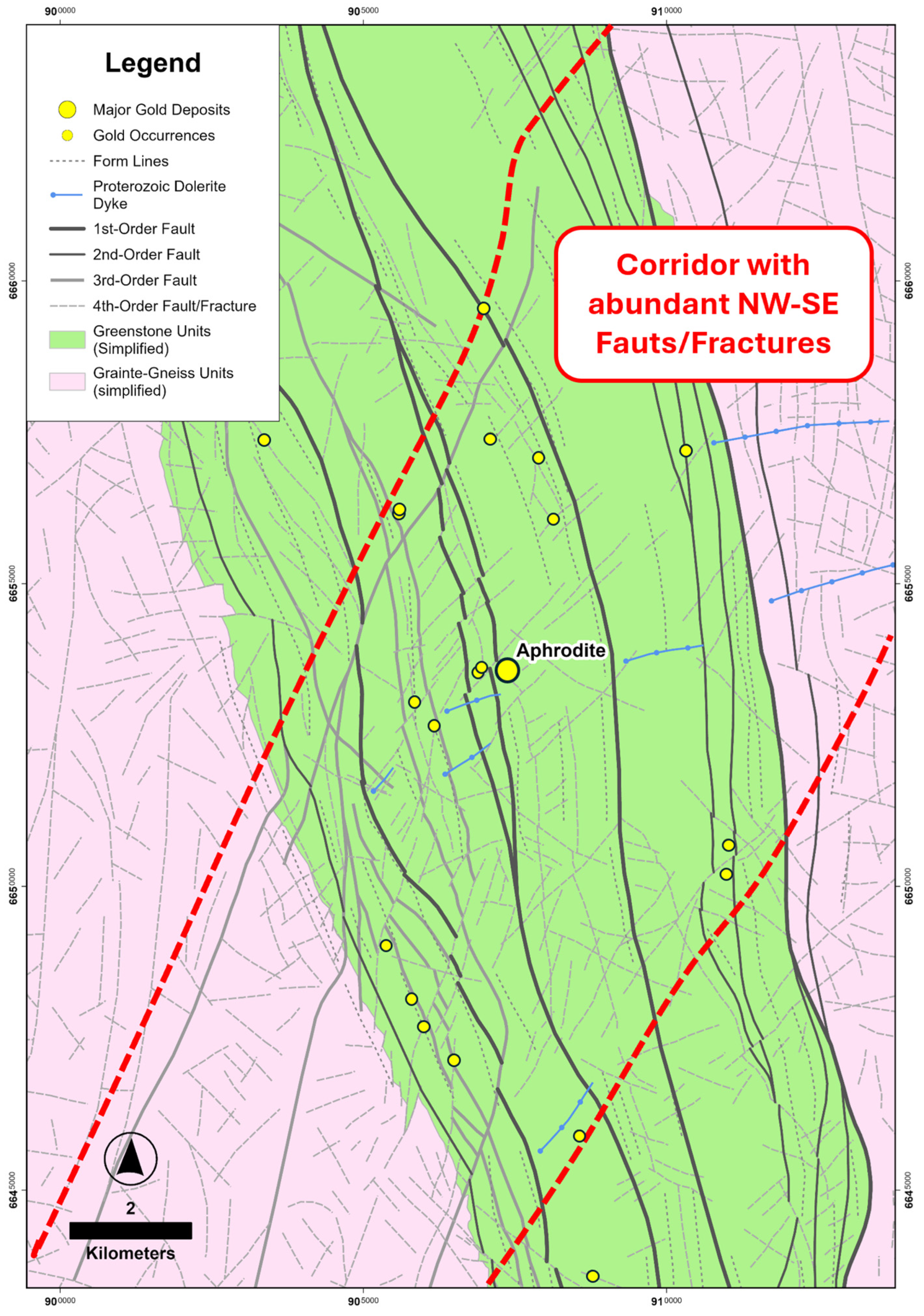 - Structural controls: Cross-cutting N-S, NE-SW, and NW-SE fault and fracture corridors overprint the greenstone belt-parallel fabric and consequently aligned with clusters of gold occurrences. Supported by Fry analysis, these oblique structures likely represent key fluid-focusing zones that controlled mineralization.