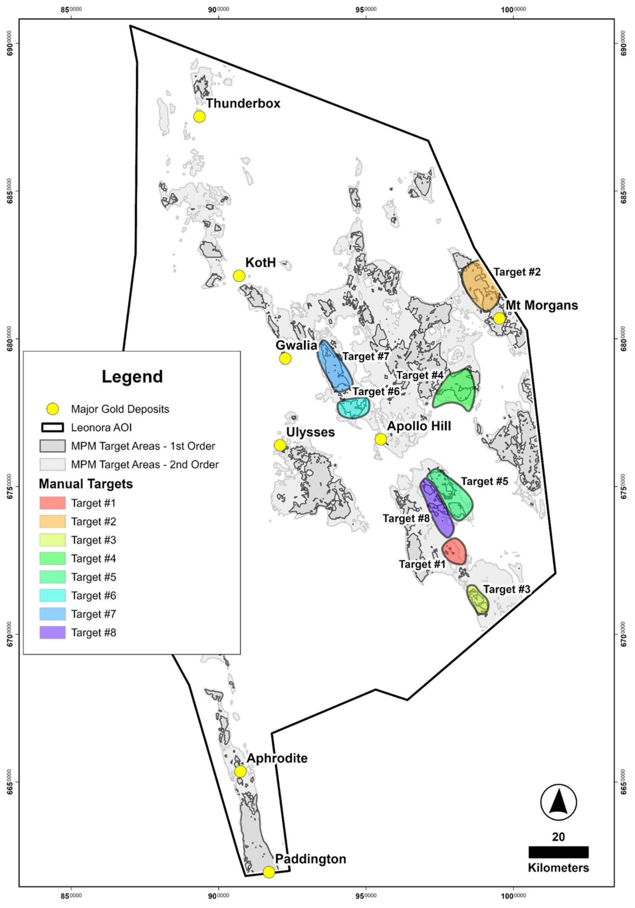 | #6 | Twenty Six Well | Lithostructural target; largely soil covered; no reported Au occurrences in 2021; proximal to 1st-order Keith–Kilkenny fault system; located along an NNW-SSE-trending gravity ridge | Minimal drilling; disjointed ownership |