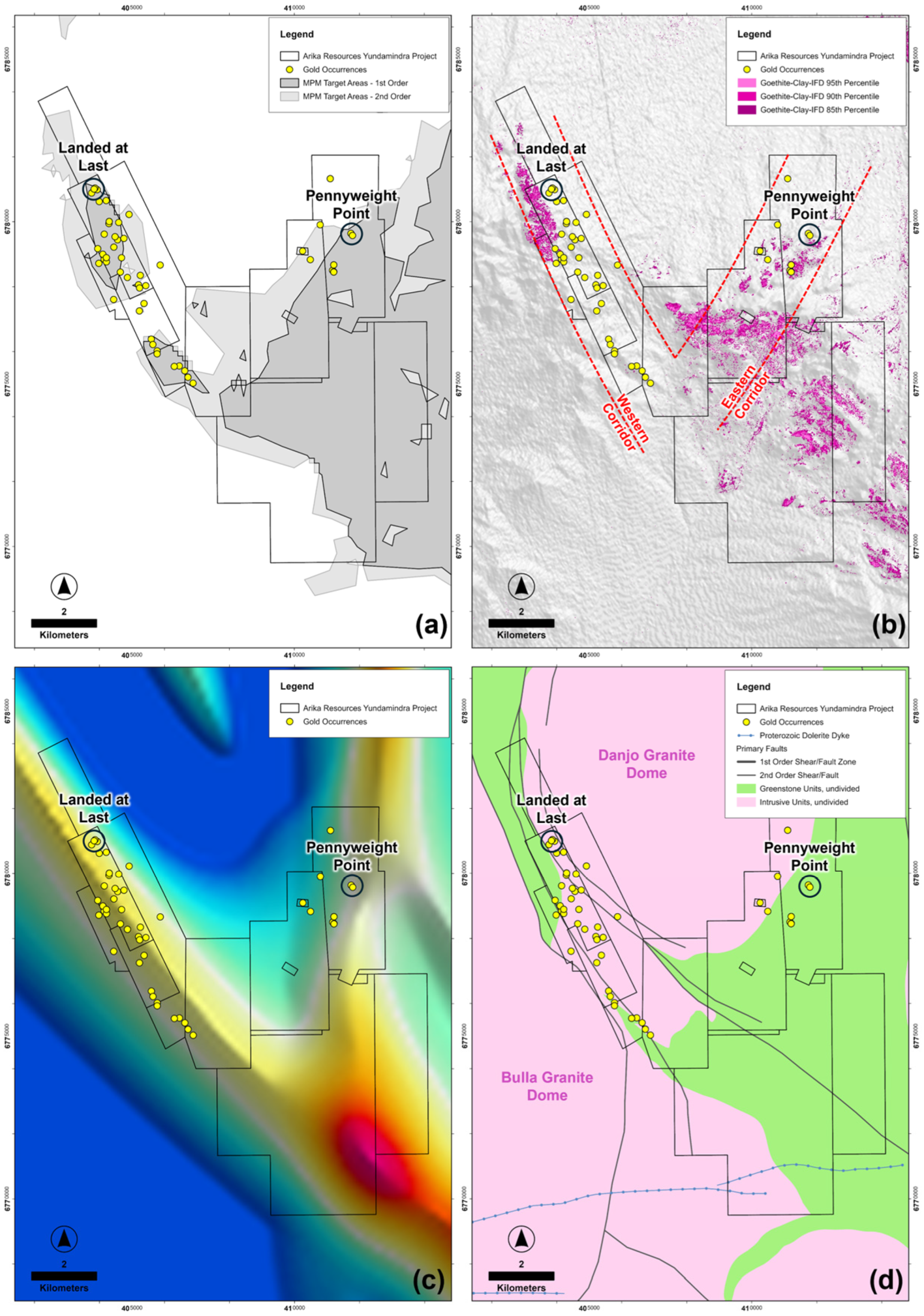 | #5 | Mt Remarkable | Lithostructural target covering part of the Pig Well Basin; no reported Au occurrences in 2021; proximal to 1st-order Keith–Kilkenny fault system; located along an NNW-SSE-trending gravity ridge | Drilling is mostly associated with the Marvellous Au occurrence; best historic drill intercept: 82.00 m @ 0.83 g/t Au; disjointed ownership; partly located within an extensive registered site of Aboriginal cultural heritage |