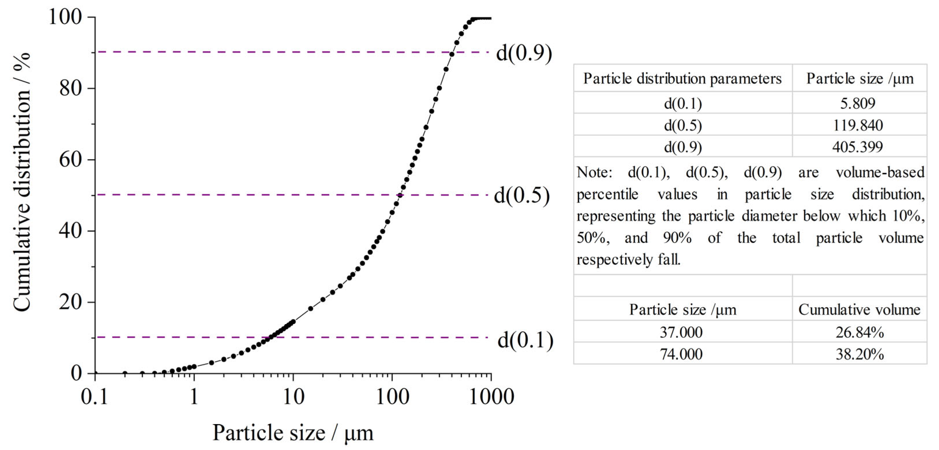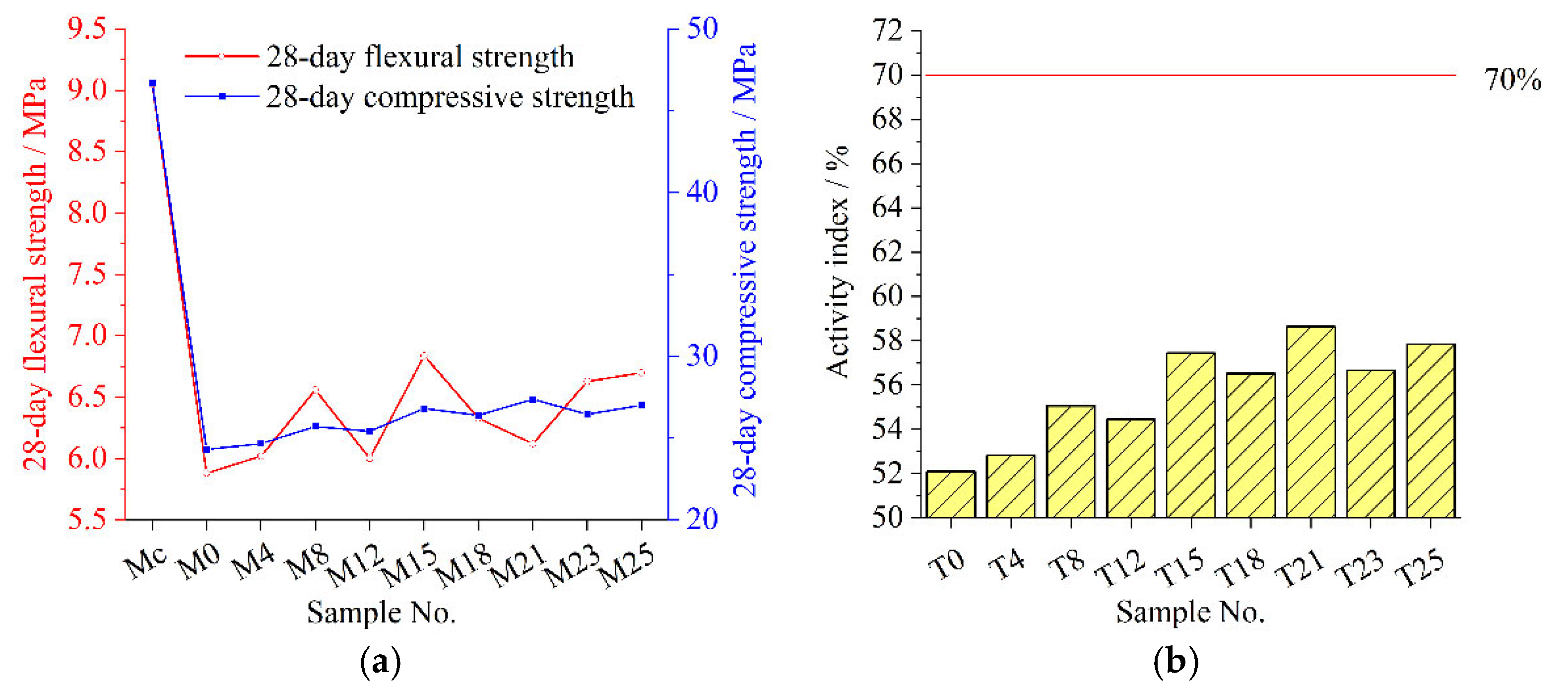 - Mechanical grinding can effectively refine tailings particles, optimize particle size distribution and specific surface area, thereby enhancing their potential pozzolanic activity. When the grinding time reaches at least 12 min, the 45 μm sieve residue of the tailings is below 30%, and the 28-day strength activity index can reach up to 58.64%. While mechanical grinding alone provides good activation, it is insufficient to achieve high-grade reactivity.