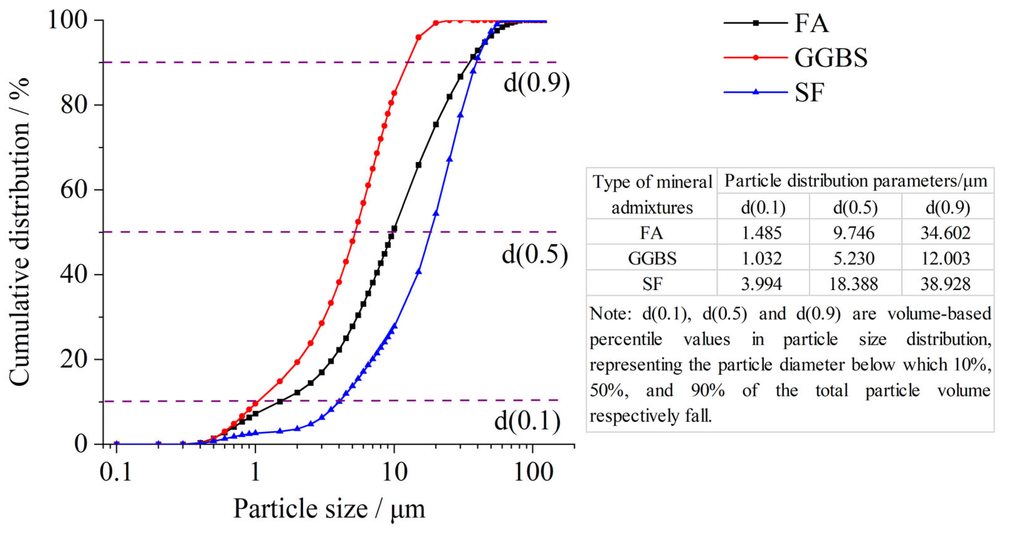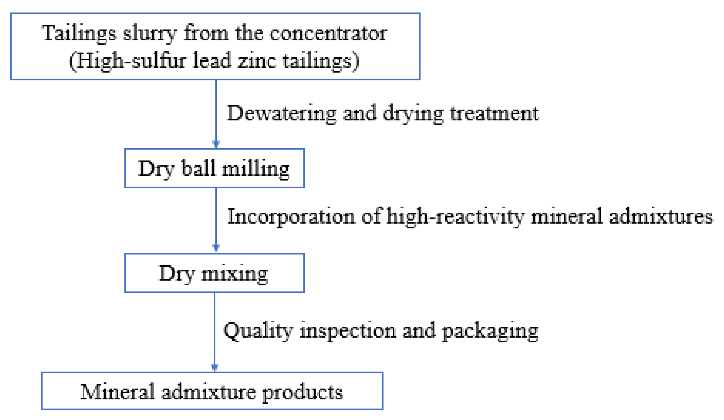 - Synergistic modification with highly active mineral admixtures: An appropriate amount of highly active mineral admixture (GGBS or SF) is added to the mechanically ground tailings and thoroughly mixed in a dry-mixing machine. After quality inspection and packaging, the tailings-based mineral admixture is obtained.
