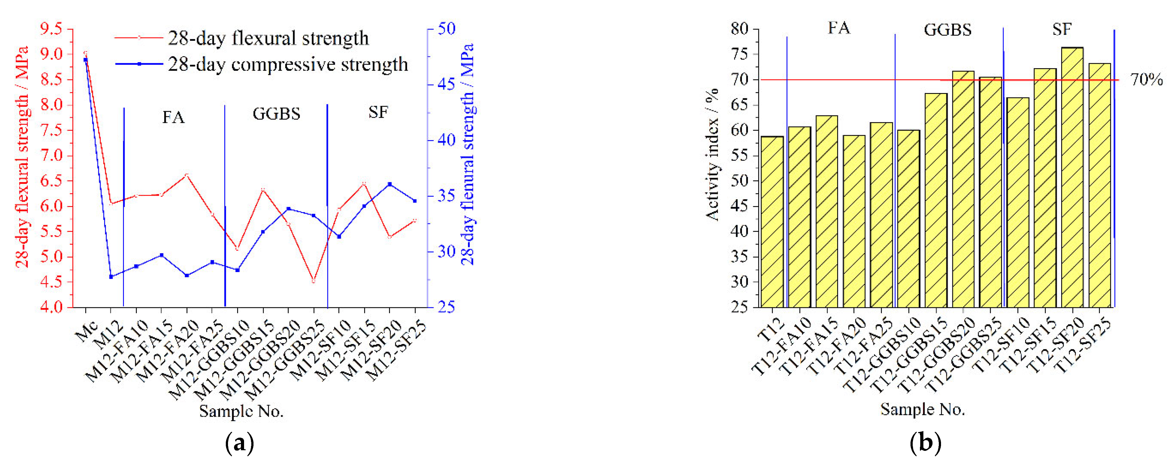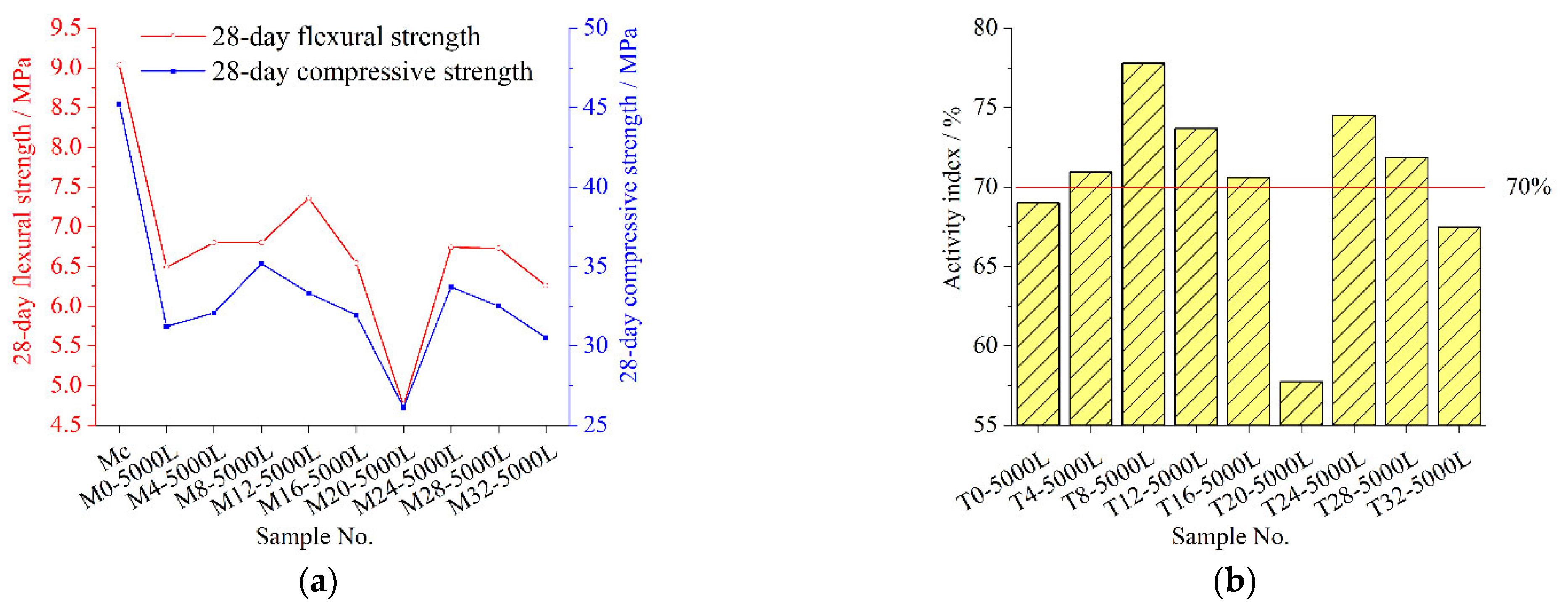 | Maximum activity index of the product | The mineral admixture T24–5000L exhibits the highest activity, reaching 74.51%. | The mineral admixture M12–SF20 exhibits the highest activity, reaching 76.35%. |