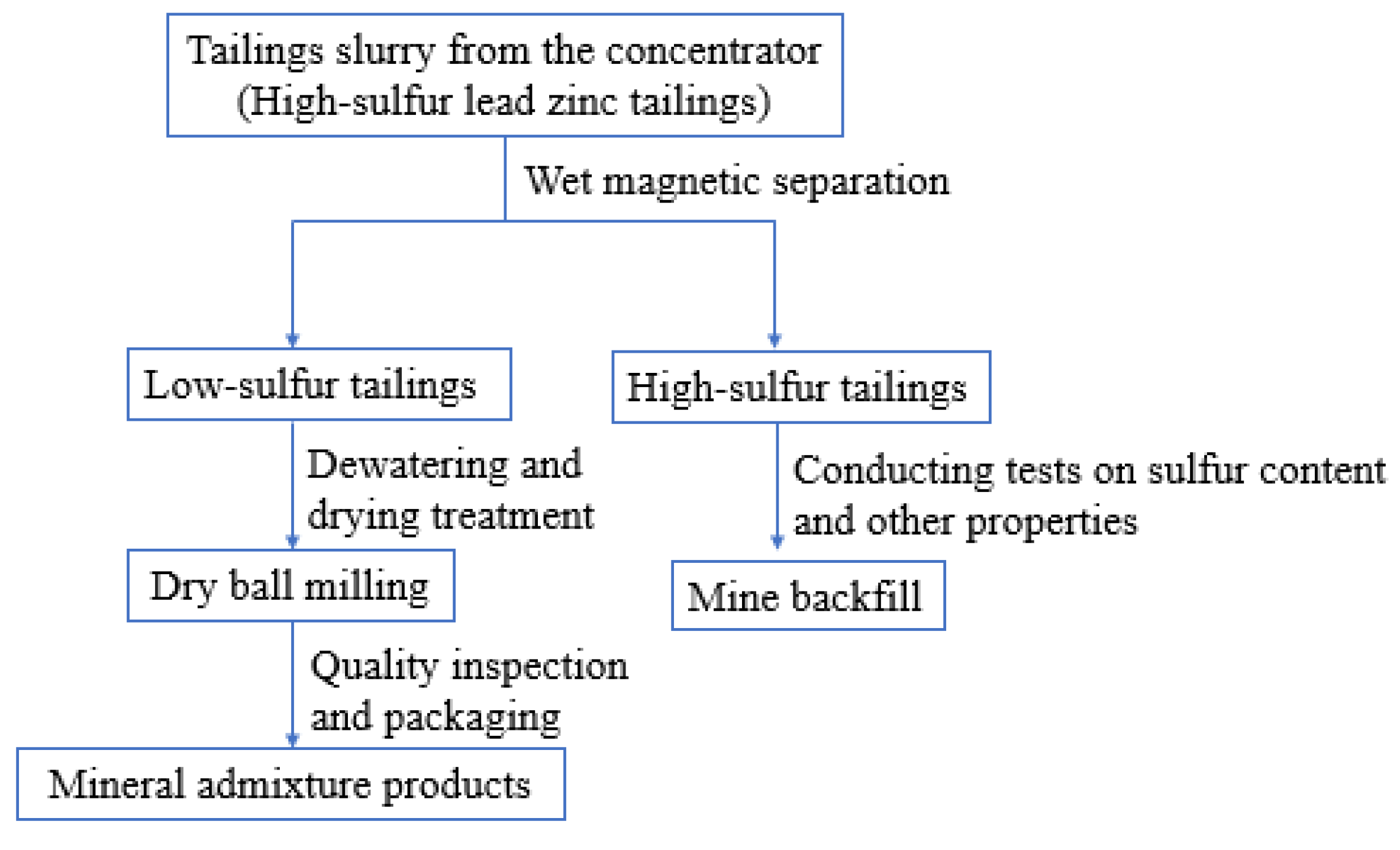 - Wet magnetic separation: High-sulfur lead–zinc tailings are subjected to wet magnetic separation using a wet magnetic separator. The sulfur content in the separated low-sulfur and high-sulfur fractions is measured. The SO3 content of the low-sulfur fraction should be below 3.5% to allow further use in mineral admixture production, while the elemental sulfur content of the high-sulfur fraction should be below 8% to meet underground backfilling requirements.