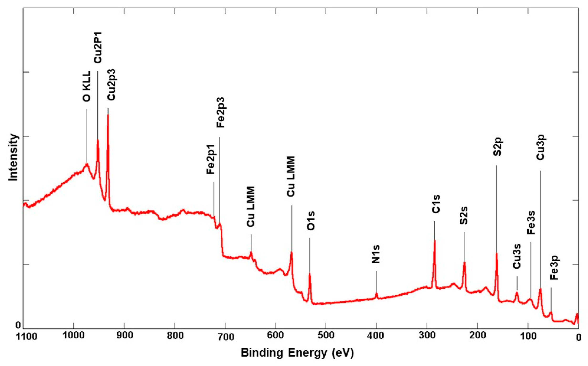3.1. Surface Analysis of Unleached Chalcopyrite