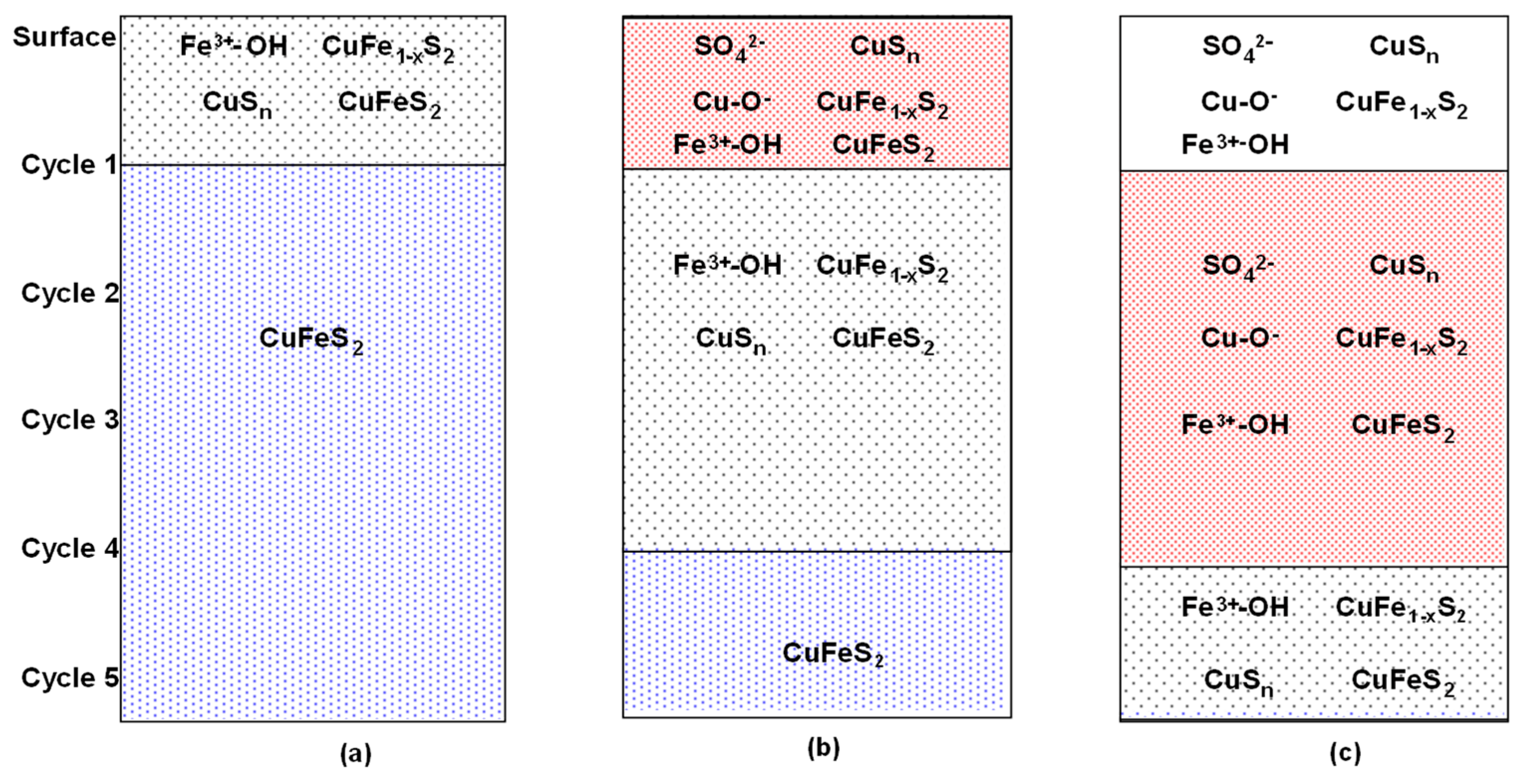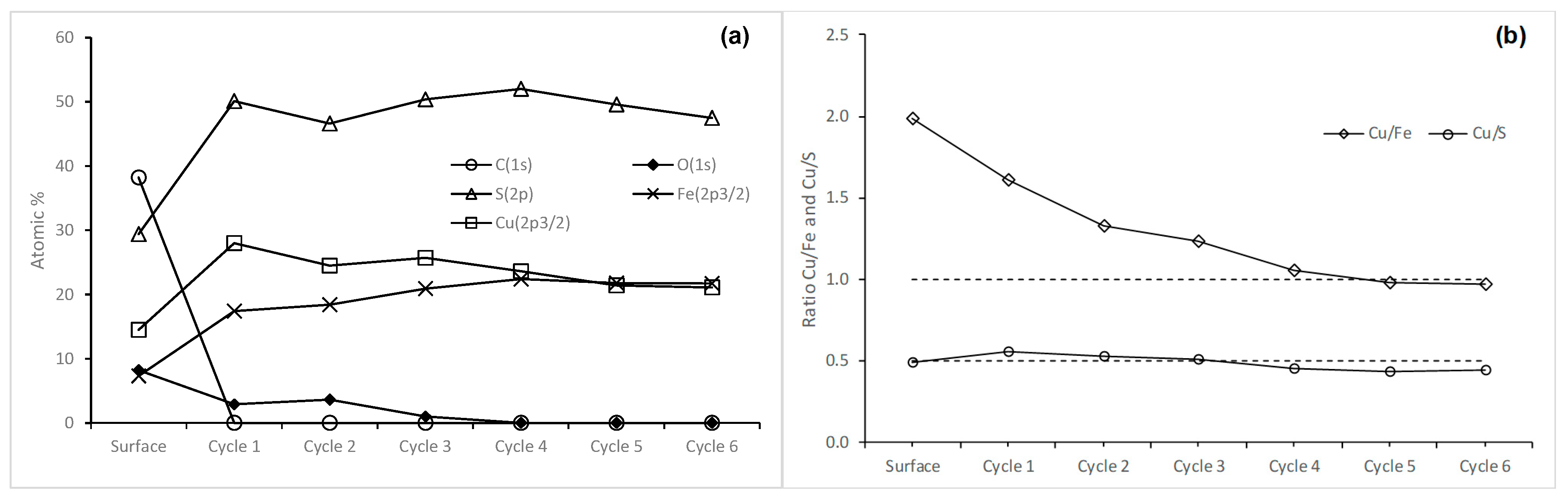 - Ghahremaninezhad, A.; Dixon, D.G.; Asselin, E. Electrochemical and XPS analysis of chalcopyrite (CuFeS2) dissolution in sulfuric acid solution. Electrochim. Acta 2013, 87, 97–112. [Google Scholar] [CrossRef]