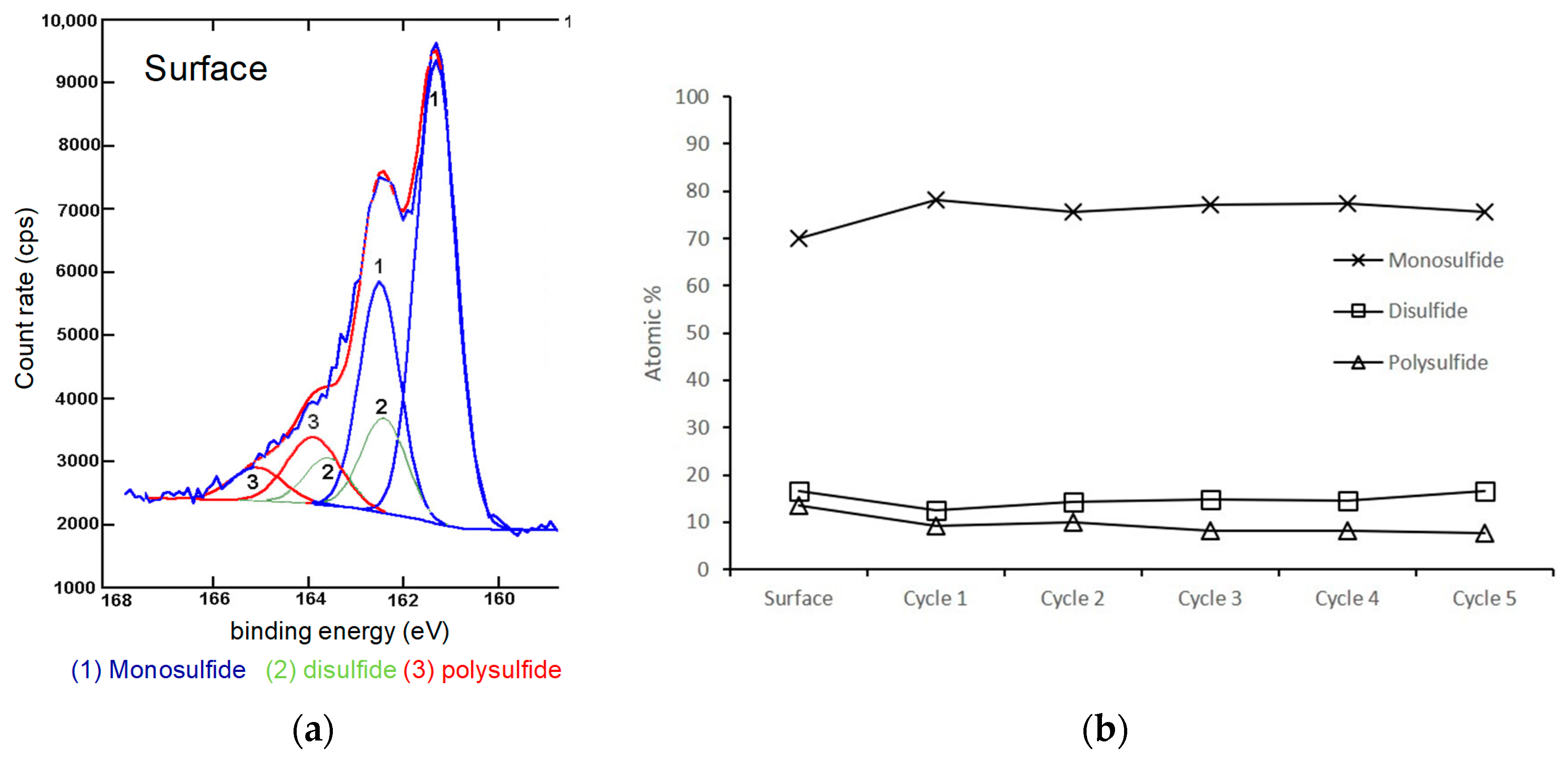 - Termes, S.C.; Buckley, A.N.; Gillard, R.D. 2P Electron Binding Energies for the Sulfur Atoms in Metal Polysulfides. Inorganica Chim. Acta 1987, 126, 79–82. [Google Scholar] [CrossRef]