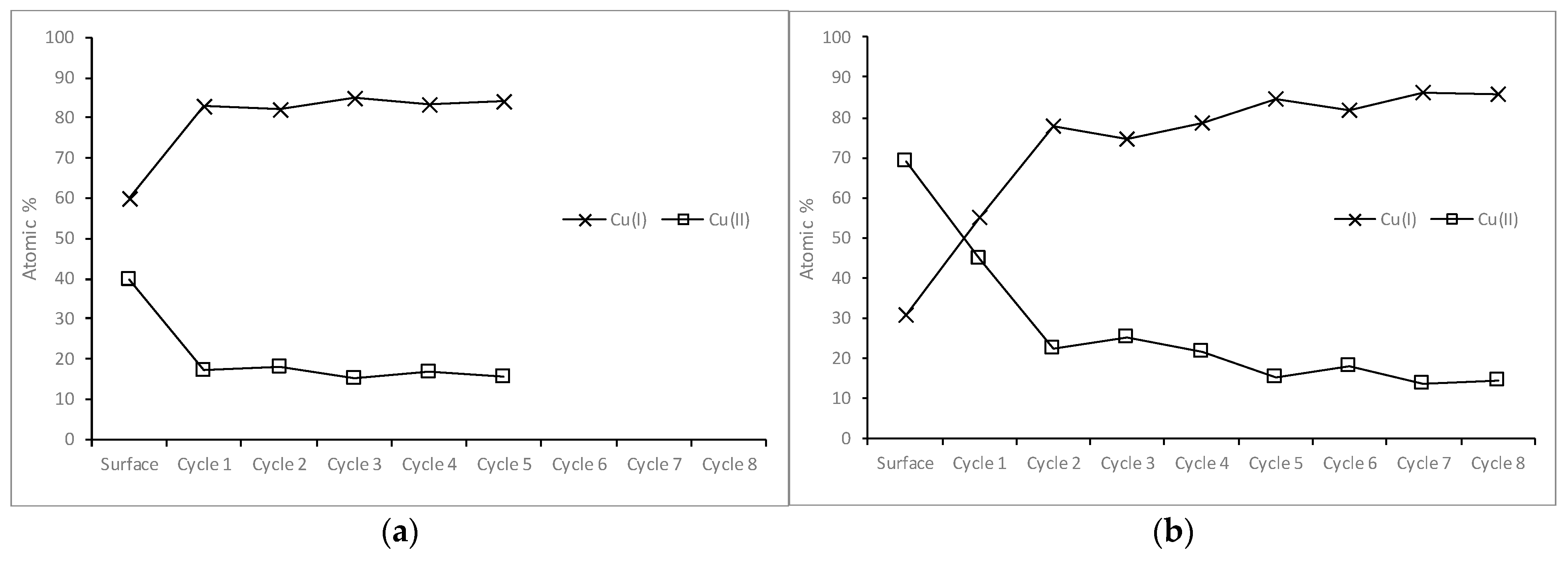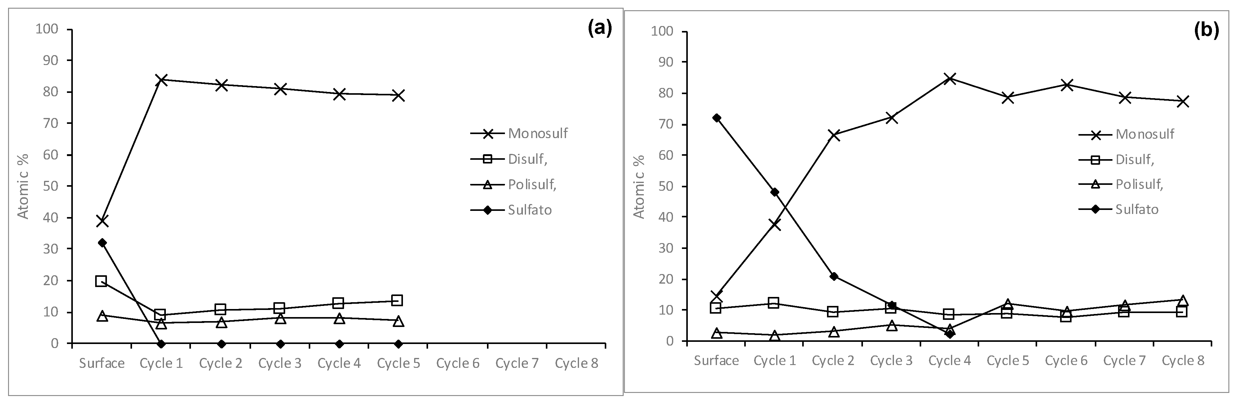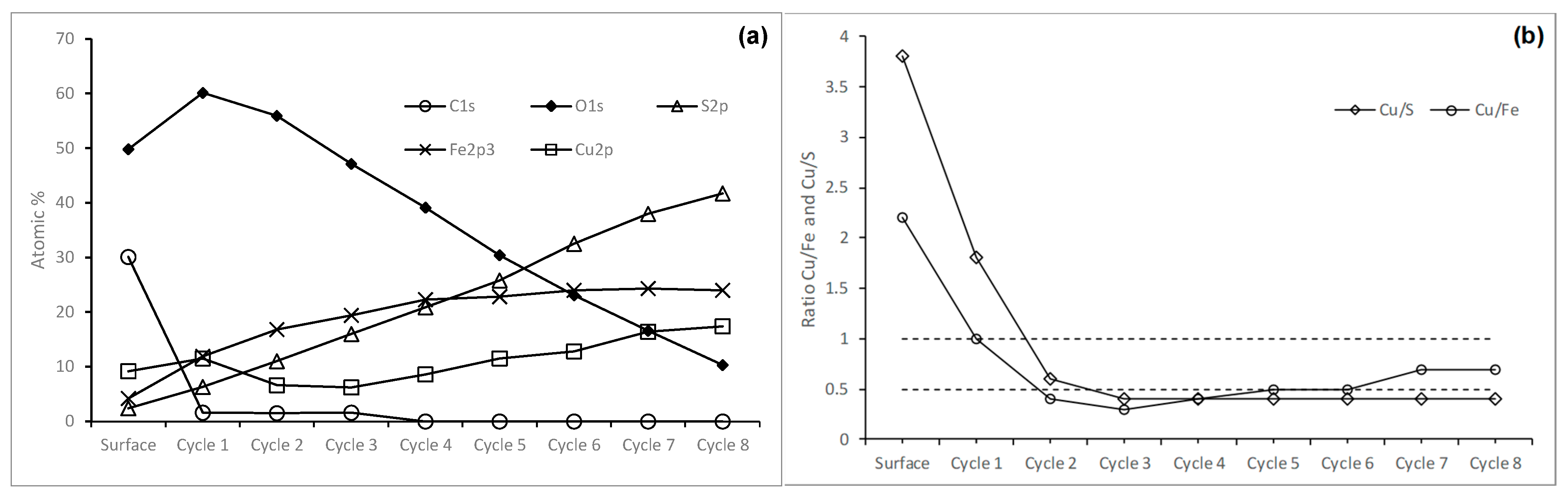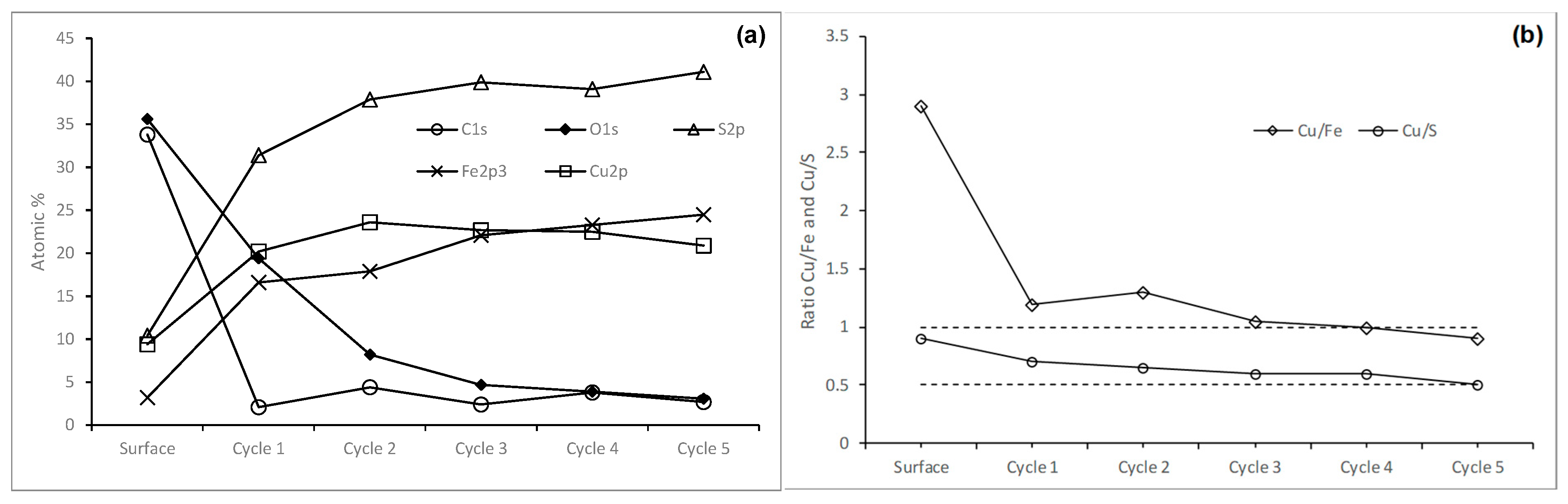 3.1.1. Analysis of the Atomic Oxidation States of Chalcopyrite