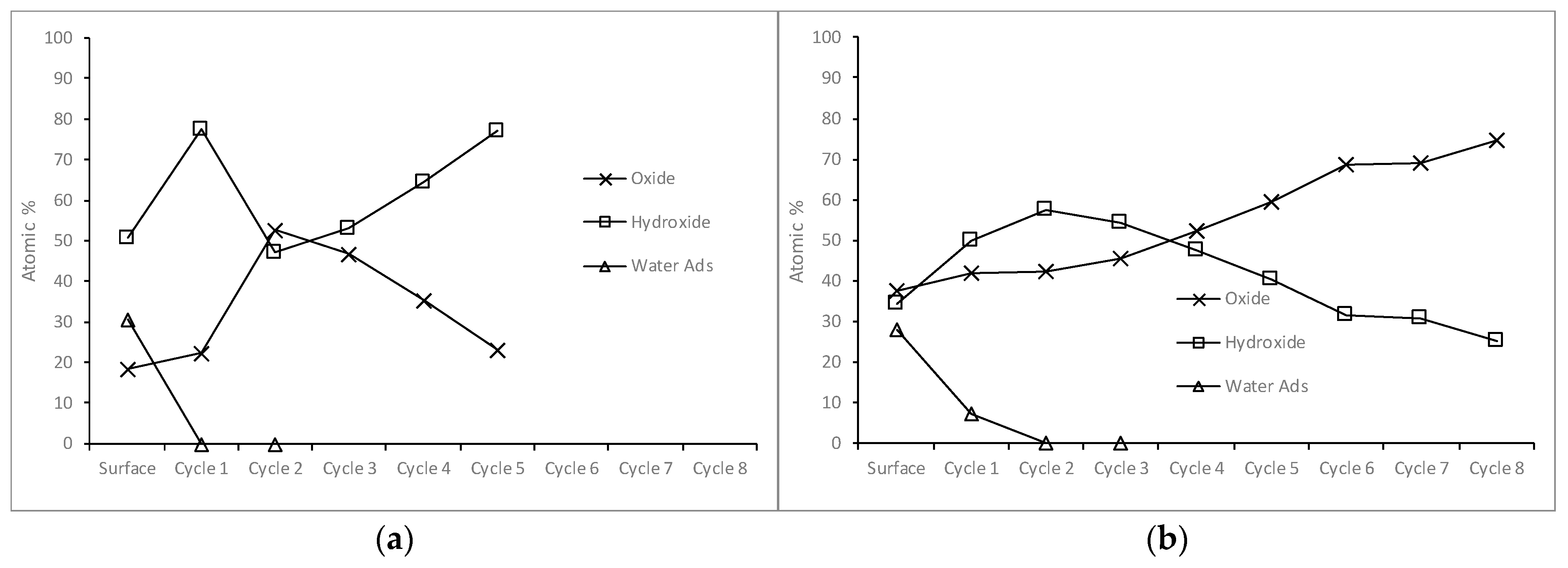 - Grosvenor, A.P.; Kobe, B.A.; McIntyre, N.S. Studies of the oxidation of iron by water vapour using X-ray photoelectron spectroscopy and QUASESTM. Surf. Sci. 2004, 572, 217–227. [Google Scholar] [CrossRef]