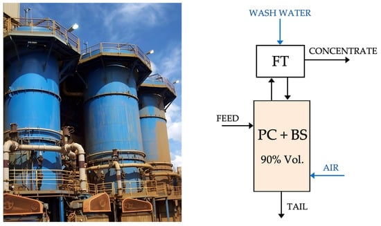 The classical pneumatic columns, used mainly in cleaner and re-cleaner duties, are also well described by two main zones: the particle collection (PC) plus bubble-separation (BS) zone, and the froth transport zone (FT). In this case, there is also a single volume where the (PC + BS) zone is confined, representing around 90% of the total cell volume, as shown in Figure 2.